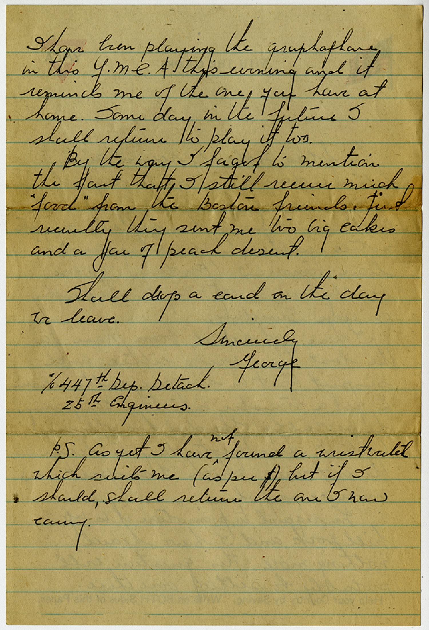 I have been playing the graphaphone in this Y.M.C.A. this evening and it reminds me of the one you have at home. Some day in the future I shall return to play it too. By the way I forgot to mention the fact that I still receive much “food” from the Boston friends. Just recently they sent me two big cakes and a jar of peach desert. Shall drop a card on the day we leave. Sincerely George c/o 447th [Depot] [Detachment] 25th Engineers P.S. as yet I have not found a wrist watch which suits me (as per $) but if I should, shall return the one I now carry.