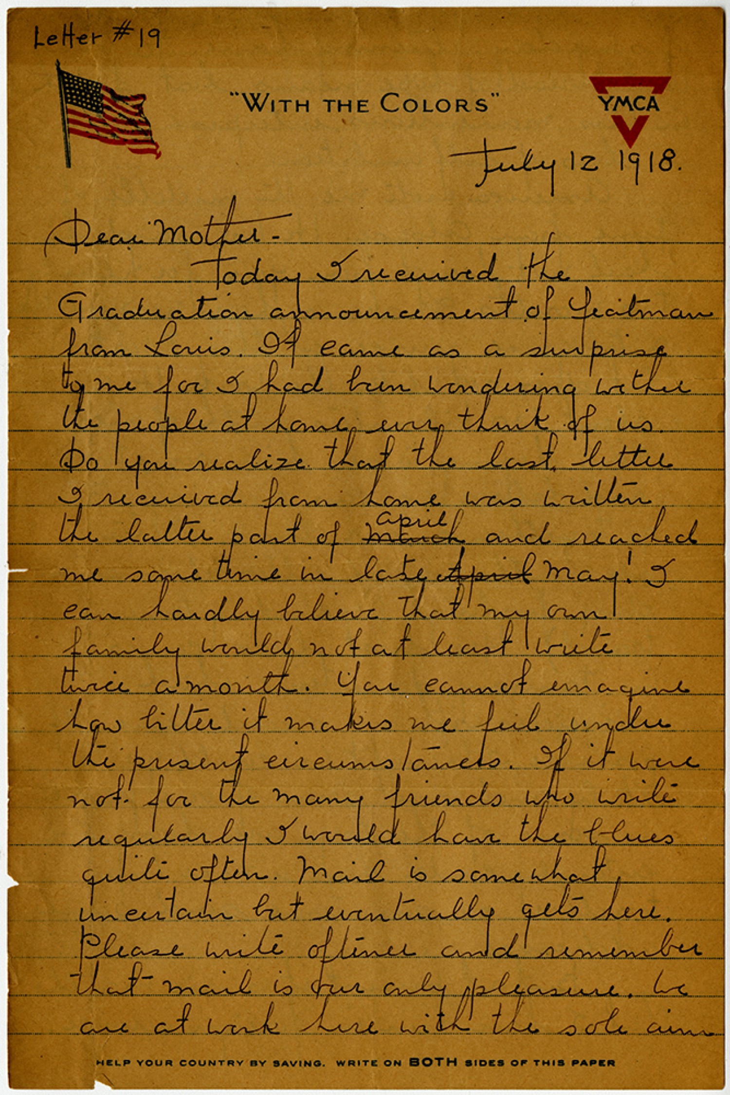 Letter #19 July 12 1918. Dear Mother – Today I received the Graduation announcement of Yeatman from Louis. It came as a surprise to me for I had been wondering wether the people at home ever think of us. Do you realize that the last letter I received from home was written the latter part of April and reached me sometime in late May! I can hardly believe that my own family would not at least write twice a month. You cannot imagine how little it makes me feel under the present circumstances. If it were not for the many friends who write regularly I would have the blues quite often. Mail is somewhat uncertain but eventually gets here. Please write oftener and remember that mail is our only pleasure. We are at work here with the sole aim