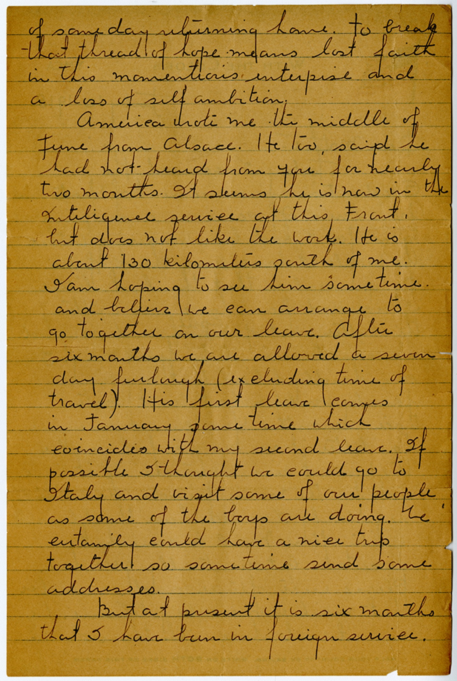 of some day returning home. to break that thread of hope means lost faith in this momentious enterprise and a loss of self ambition. America wrote me the middle of June from Alsace. He too, said he had not heard from you for nearly two months. It seems he is now in the Inteligence service at this Front, but does not like the work. He is about 130 kilometers south of me. I am hoping to see him sometime and believe we can arrange to go together on our leave. After six months we are allowed a seven day furlough (excluding time of travel). His first leave comes in January some time which coincides with my second leave. If possible I thought we could go to Italy and visit some of our people as some of the boys are doing. We certainly could have a nice trip together so sometime send some addresses. But at present it is six months that I have been in foreign service.