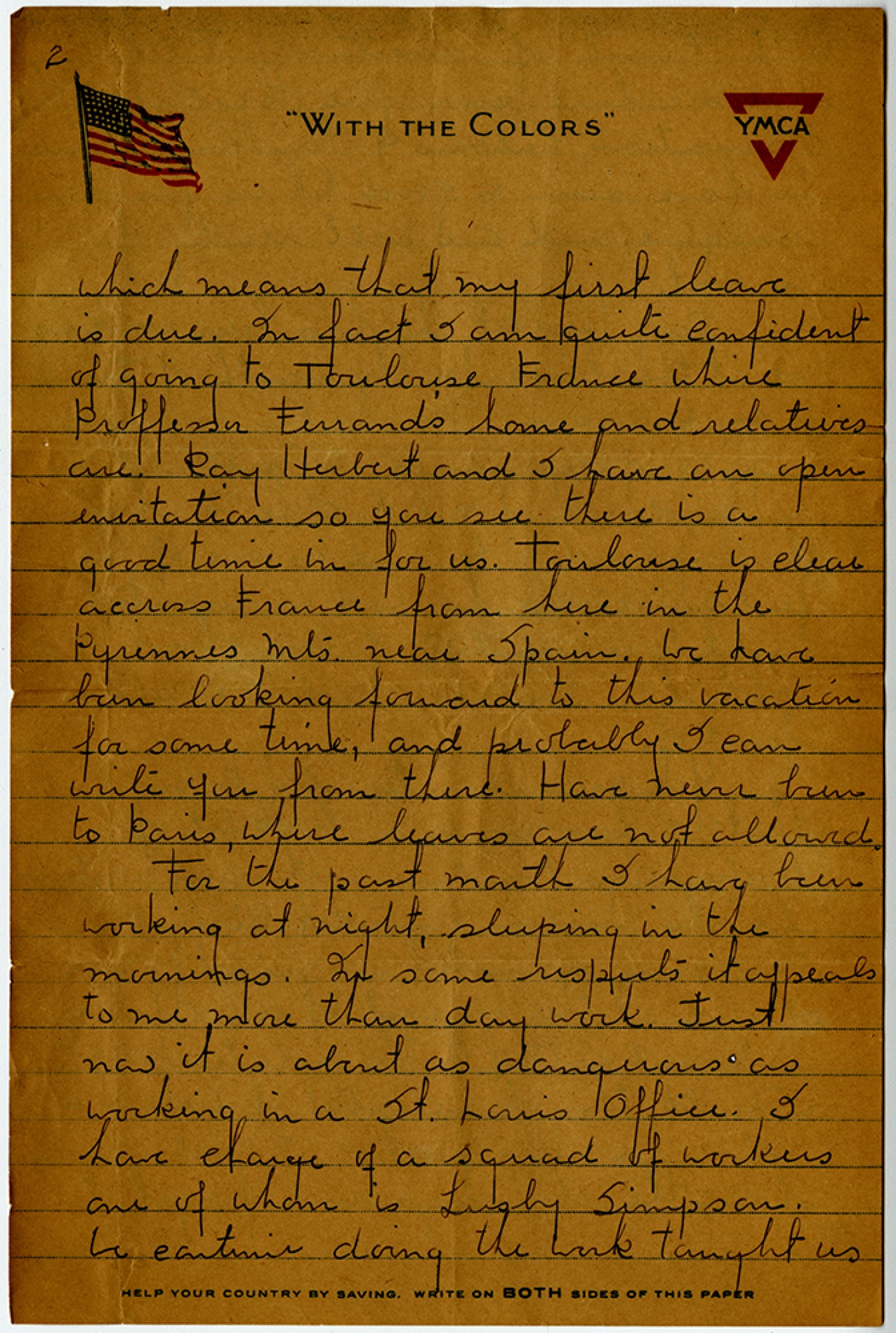 2 which means that my first leave is due. In fact I am quite confident of going to Toulouse France where Professor Ferrand’s home and relatives are. Ray Herbert and I have an open initiation so you see there is a good time in for us. Toulouse is clear accross France from here in the [Pyrenees Mountains] near Spain. We have been looking forward to this vacation for some time, and probably I can write you from there. Have never been to Paris, where leaves are not allowed. For the past month I have been working at night, sleeping in the mornings. In some respects it appeals to me more than day work. Just now it is about as dangerous as working in a St. Louis office. I have charge of a squad of workers one of whom is Leisly Simpson. We continue doing the work taught us