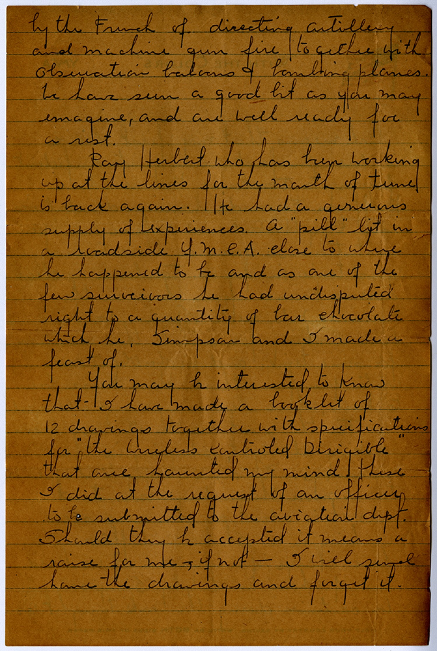 by the French of directing artillery and machine gun fire together with observation baloons & bombing planes. We have seen a good bit as you may imagine, and are well ready for a rest. Ray Herbert who has been working up at the lines for the month of June is back again. He had a generous supply of experiences. A “pill” lit in a road side Y.M.C.A. close to where he happened to be and as one of the few survivors he had undisputed right to a quantity of bar chocolate which he, Simpson and I made a feast of. You may be interested to know that I have made a booklet of 12 drawings together with specifications for “the Wireless Controled Dirigible” that once haunted my mind. These I did at the request of an officer to be submitted to the aviation dept. Should they be accepted it means a raise for me – if not – I will send home the drawings and forget it.