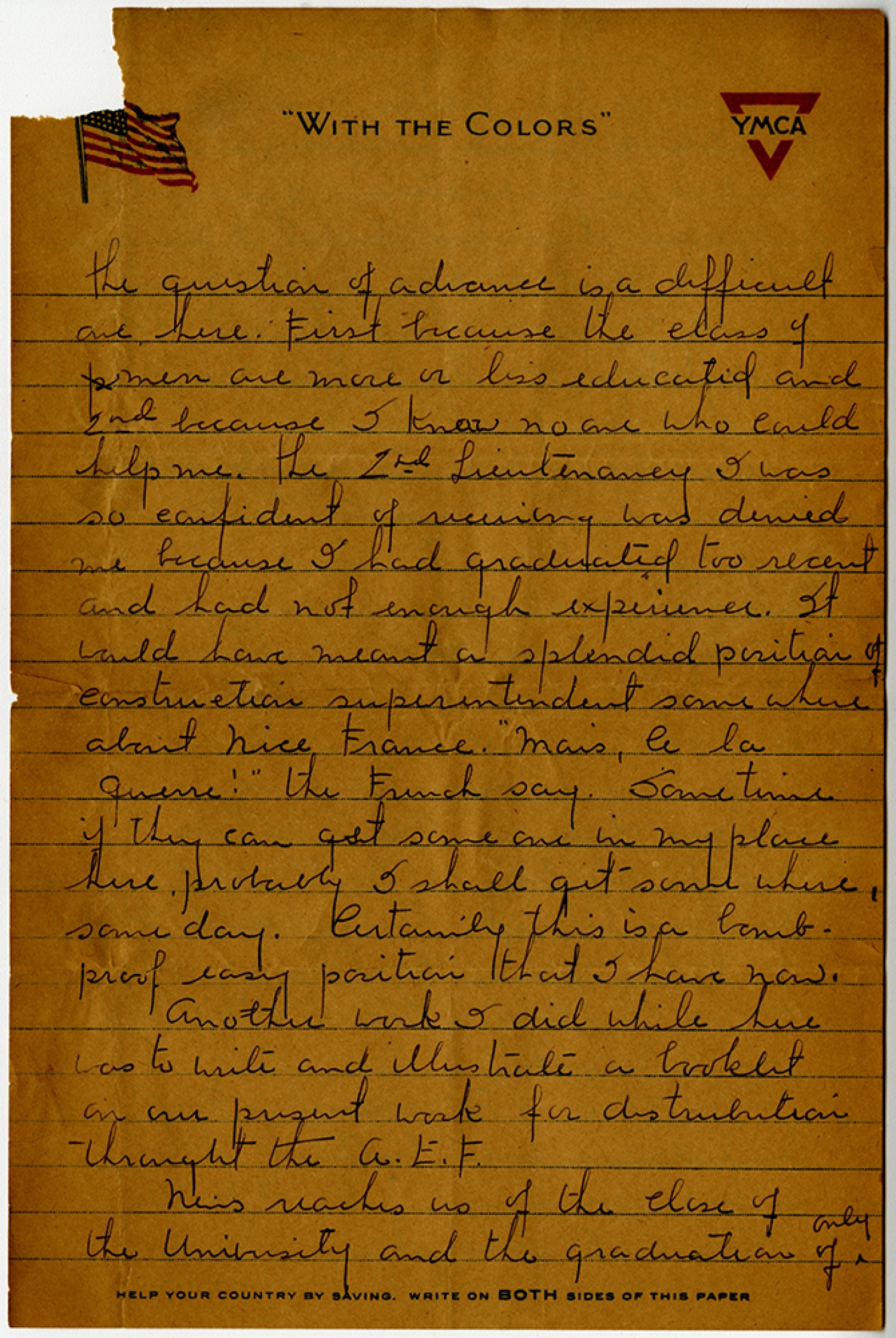 | Description | George J. Maguolo wrote a letter to his Mother on July 12, 1918 while in France. Maguolo was in the 29th Engineers Company H and served in France until 1919. In this letter Maguolo provided more insight into what his job detailed. He also wrote that he had submitted 12 drawings of his wireless controlled dirigible to an officer and had illustrated a booklet for distribution throughout the A.E.F. This letter was written on Y.M.C.A. letterhead. |