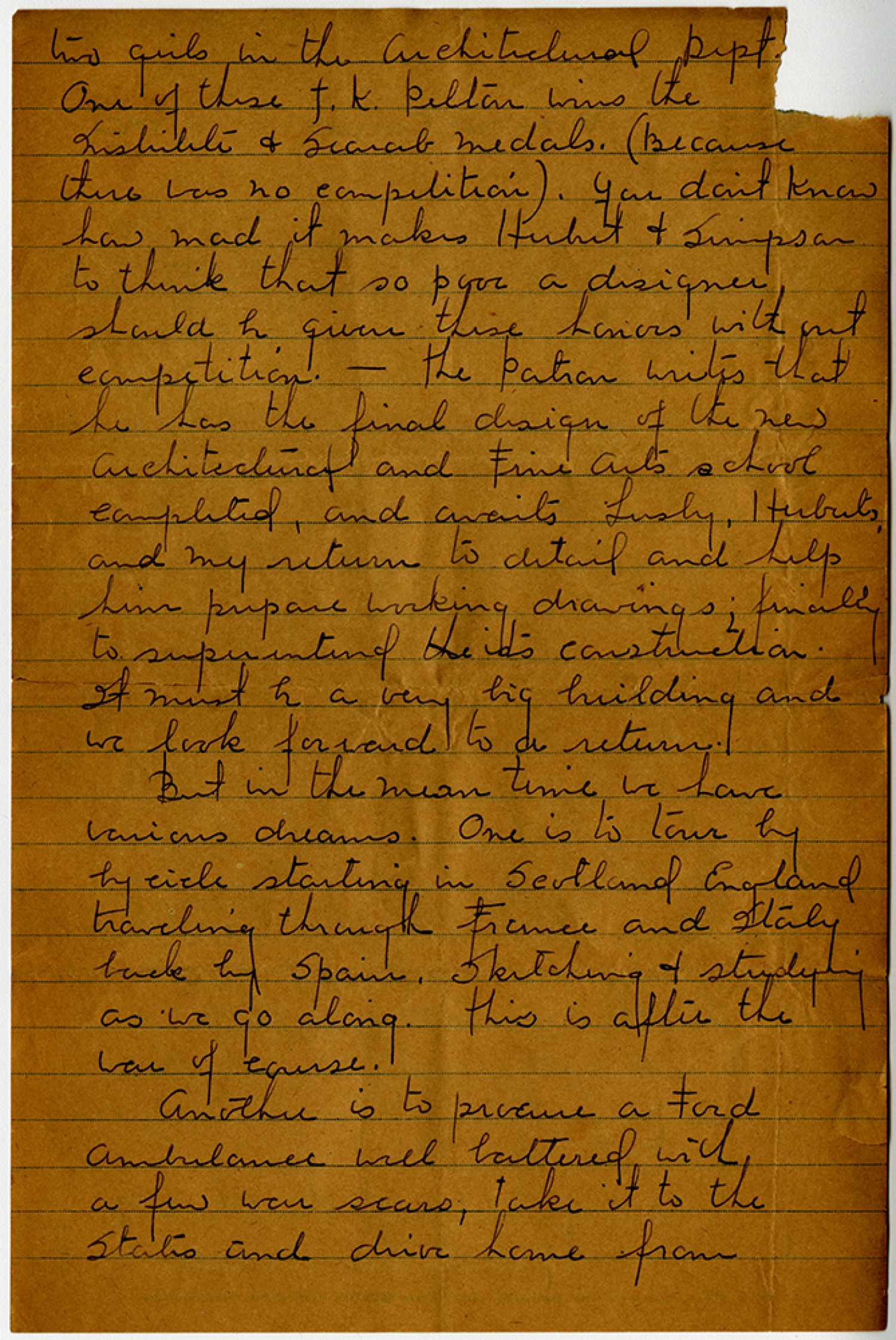two girls in the Architectural Dept. One of these J. K Pelton wins the Institute and Scarab medals. (Because there was no competition). You don’t know how mad it makes Herbert & Simpson to think that so poor a designer should be given these honors without competition. - The Patron writes that he has the final design of the new architectural and Fine Arts school completed, and awaits Lesly, Herberts, and my return to detail and help him prepare working drawings; finally to superintend its construction. It must be a very big building and we look forward to a return. But in the mean time we have various dreams. One is to tour by bycicle starting in Scotland England traveling through France and Italy back by Spain. Sketching & studying as we go along. This is after the war of course. Another is to procure a Ford ambulance well battered with a few war scars, take it to the States and drive home from