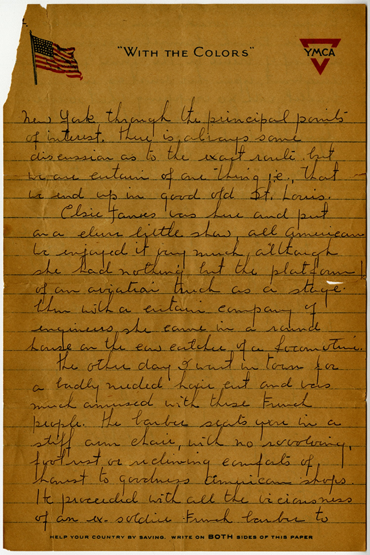 New York through the principal points of interest. There is always some discussion as to the exact route but we are certain of one thing i.e. , that we end up in good old St. Louis. Elsie Janis was here and put on a clever little show, all American. We enjoyed it very much although she had nothing but the platform of an aviation truck as a stage. When with a certain company of engineers she came in a round house on the cow catcher of a locomotive. The other day I went in town for a badly needed hair cut and was much amused with these French people. The barber seats you in a stiff arm chair, with no revolving, foot rest or reclining comforts of honest to goodness American shops. He proceeds with all the viciousness of an ex-soldier French barber to