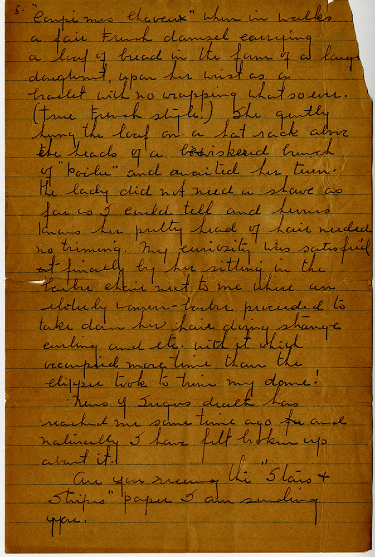 5. “Coupe mes Cheveux” when in walks a fair French damsel carrying a loaf of bread in the form of a large doughnut, upon her wrist as a bracelet with no wrapping whatsoever. (True French style.) She gently hung the loaf on a hat rack above the heads of a bewiskered bunch of “Poilu” and awaited her turn. The lady did not need a shave as far as I could tell and heavens knows her pretty head of hair needed no trimming. My curiosity was satisfied finally by her sitting in the barber chair next to me where an elderly women – barber proceeded to take down her hair doing strange curling and etc. with it which occupied more time than the clipper took to trim my dome! News of Sugers death has reached me some time ago and naturally I have felt broken up about it. Are you receiving the “Stars & Stripes” paper I am sending yyou.
