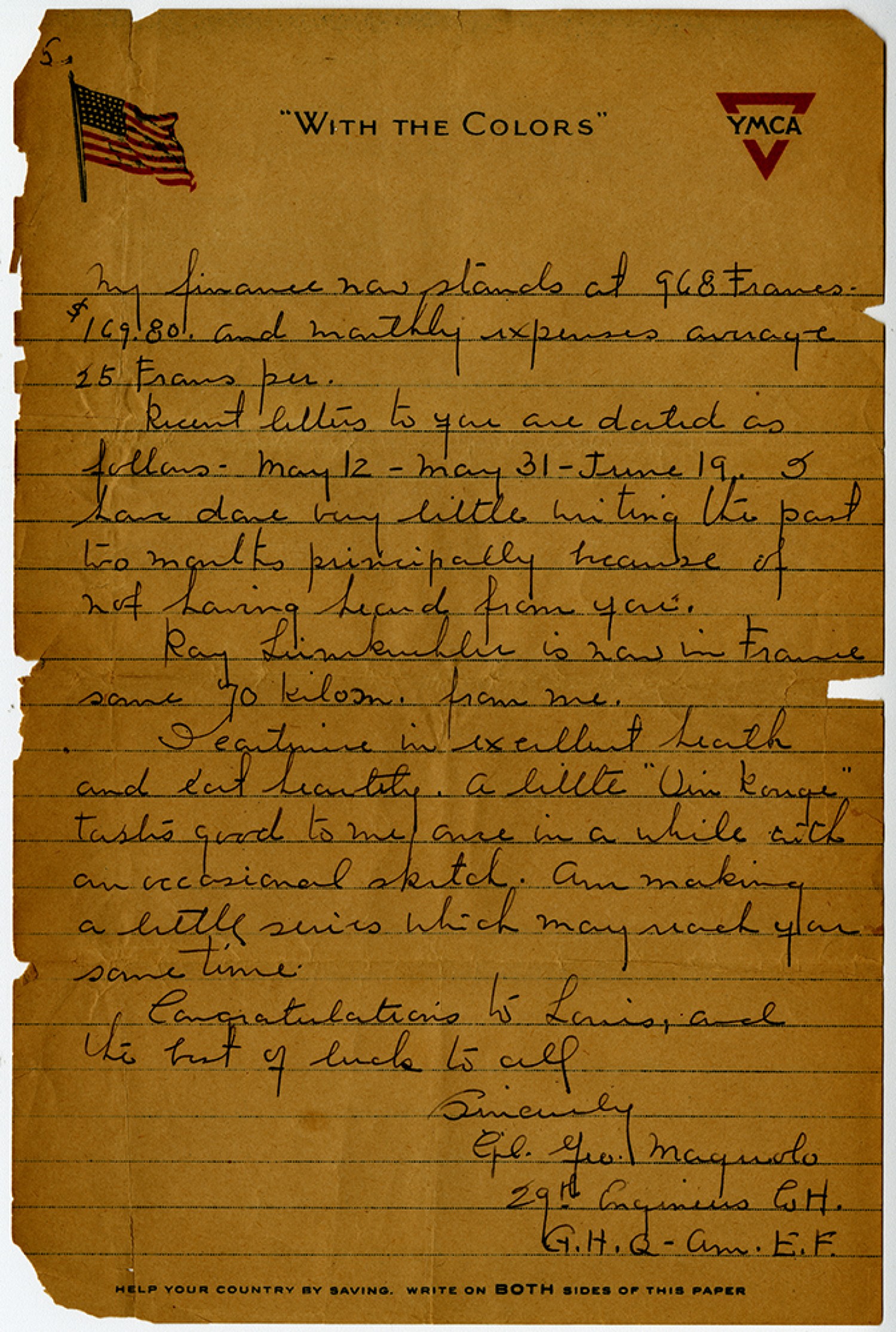 5. My finances now stands at 968 Francs - $169.80 and monthly expenses average 25 Francs per. Recent letters to you are dated as follows - May 12 – May 32 – June 19. I have done very little writing the past two months principally because of not having heard from you. Ray Limkinbler is now in France some 70 kilom. from me. I continue in excellent health and eat healthy. A little “Vin Konge” tastes good to me once in a while with an occasional sketch. Am making a little series which may reach you some time. Congratulations to Louis, and the best of luck to all Sincerely, [Corporal] [George] Maguolo 29th Engineers Co. H [General Headquarters] [American Expeditionary Forces]