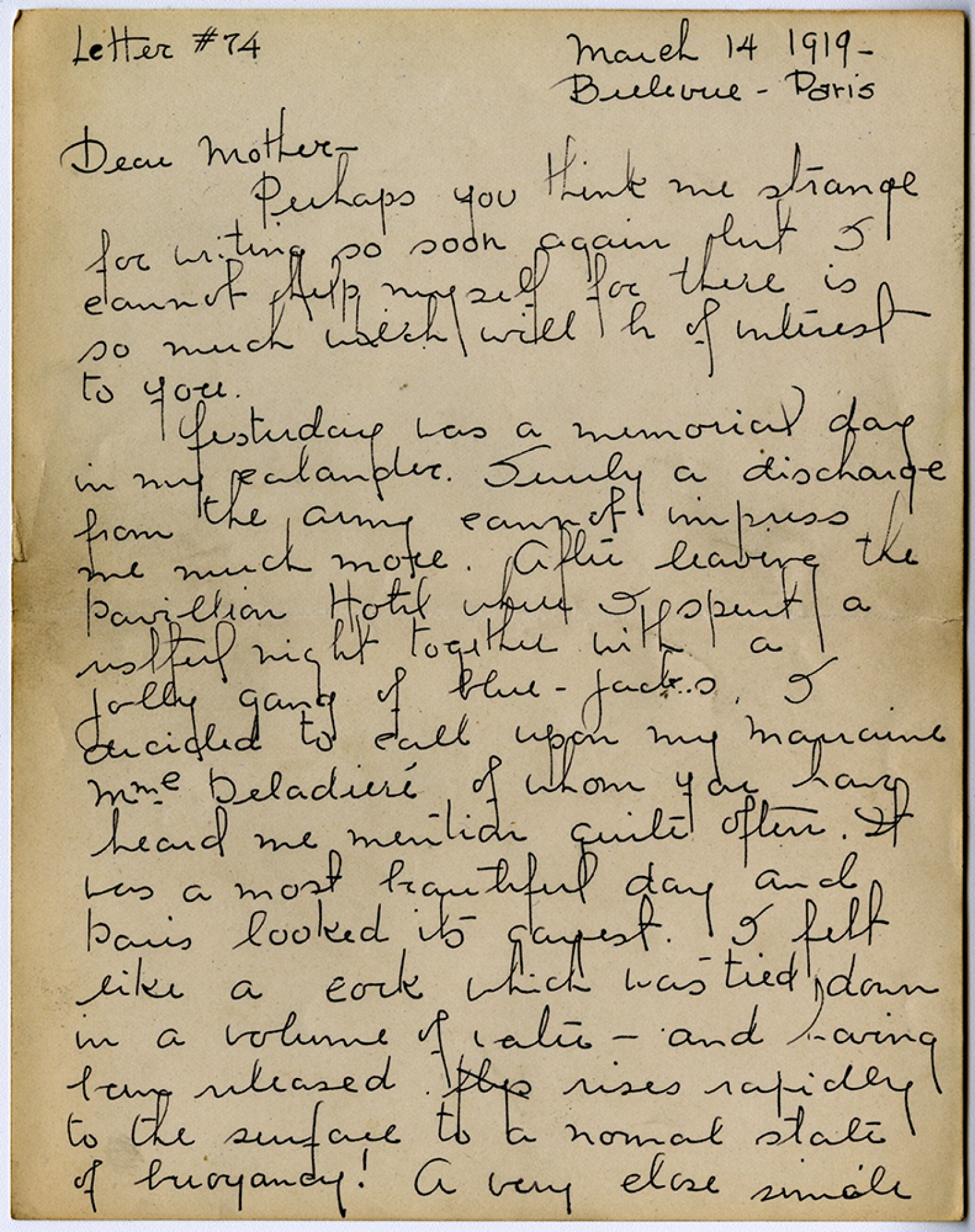 Letter #74 March 14, 1919 - Bellevue - Paris Dear Mother – Perhaps you think me strange for writing so soon again but I cannot help myself for there is so much wich will be of interest to you. Yesterday was a memorial day in my calendar. Surely a discharge from the Army cannot impress me much more. After leaving the Pavillion Hotel where I spent a restful night together with a jolly gang of blue - jacks. I decided to call upon my mariaine Mme Deladiere’ of whom you have heard me mention quite often. It was a most beautiful day and Paris looked its gayest. I felt like a cork which was tied down in a volume of water – and having been released rises rapidly to the surface to a normal state of buoyancy! A very close simile