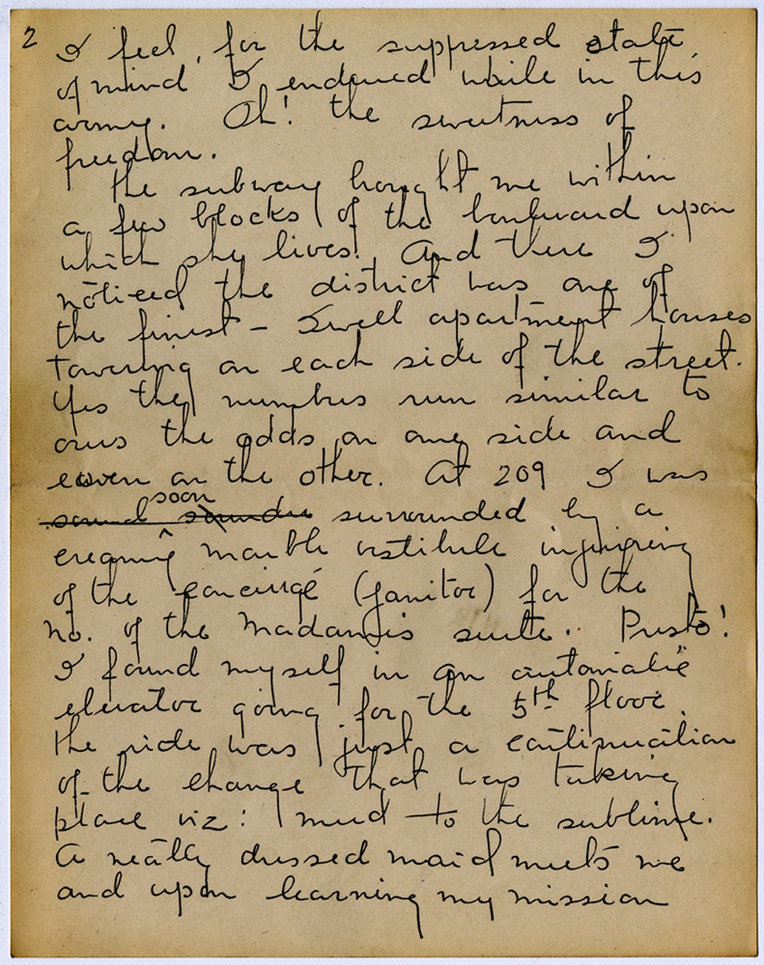 [page 2] I feel for the suppressed state of mind I endured while in the army. Oh! the sweetness of freedom. the subway brought me within a few blocks of the boulevard upon which she lives. And there I noticed the district was one of the finest – Swell apartment houses towering on each side of the street. Yes the numbers run similar to ours the odds on one side and even on the other. At 209 I was soon surrounded by a creamy marble vestibule inquiring of the concierge (janitor) for the no. of the Madame’s suite. Presto! I found myself in an automatic elevator going for the 5th floor. the ride was just a continuation of the change that was taking place nz: mud to the sublime. A neatly dressed maid meets me and upon learning my mission