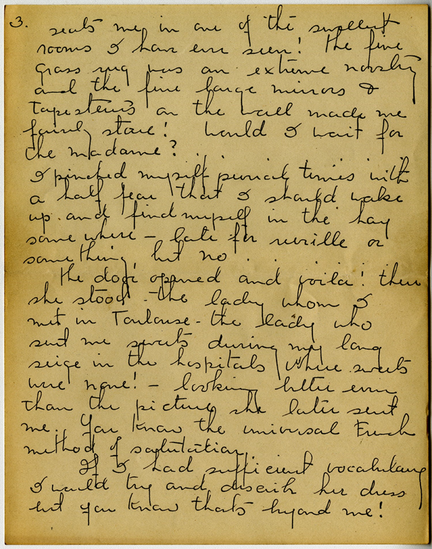 [page 3] seats me in one of the swellest rooms I have ever seen! the fine grass rug was an extreme novelty and the fine large mirrors & tapestries on the wall made me fairly stone! Would I wait for the madame? I pinched myself several times with a half fear that I should wake up and find myself in the hay somewhere – late for reville or something, but no . . . . . . the door opened and voila ! there she stood the lady whom I met in Toulouse – the lady who sent me sweets during my long seige in the hospitals where sweets were none! - looking better even than the picture she later sent me. You know the universal French method of salutation. If I had sufficient vocabulary I would try and describe her dress but you know thats beyond me!