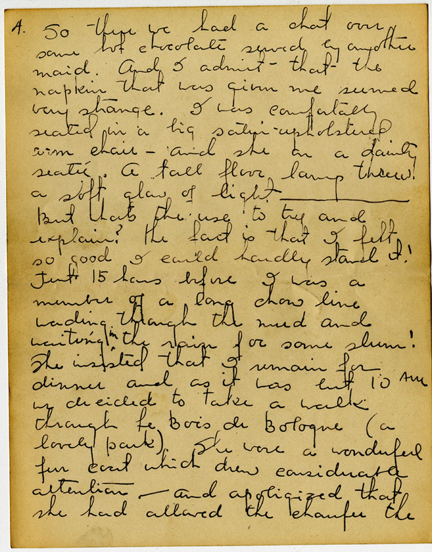 [page 4] So there we had a chat over some hot chocolate served by another maid. And I admit – that the napkin that was given me seemed very strange. I was comfortably seated in a big satin upholestered arm chair – and she on a dainty seatee. A tall floor lamp threw a soft glow of light. - But whats the use to try and explain? the fact is that I felt so good I could hardly stand it! Just 15 hours before I was a member of a long chow line wading through the mud and waiting in the rain for some slum! She insisted that I remain for dinner and as it was but 10 AM we decided to take a walk through Le Bois de Bologne (a lovely Park). She wore a wonderful fur coat which drew considerable attention – and apologized that she had allowed the chaufer the
