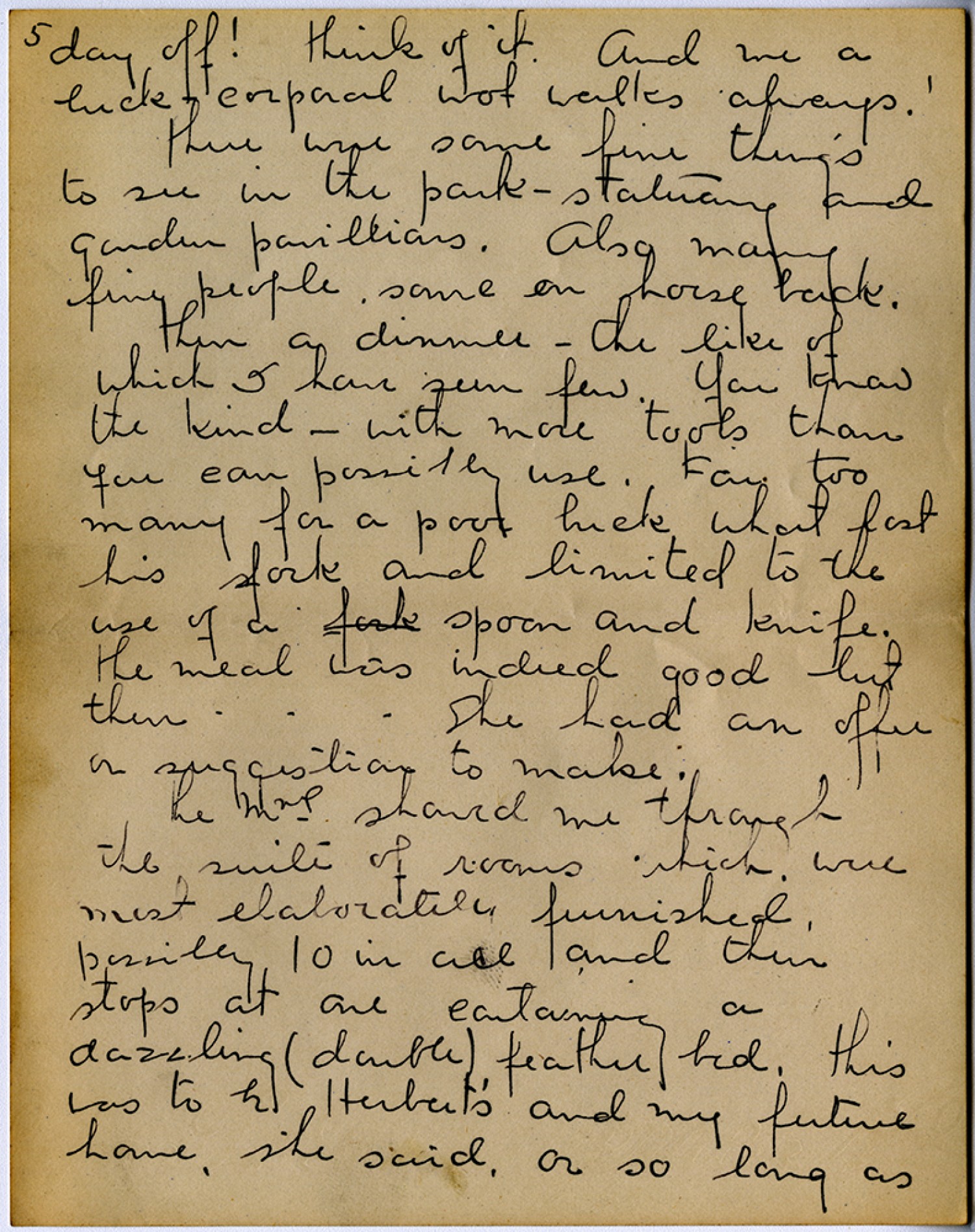 [page 5] day off! think of it. And me a buck corporal [msillegible: 1 wd] walks always. there were some fine things to see in the park – statuary and garden pavillions. Also many fine people some on horse back. then a dinner – the like of which I have seen few. You know the kind – with more tools than you can possibly use. Far too many for a poor buck what lost his fork spoon and knife. the meal was indeed good but then . . . She had an offer or suggestion to make. the Mme showed me through the suite of rooms which were most elaborately furnished possibly 10 in all and then stops at one containing a dazzling (double), feather bed. this was to be Herbert’s and my future home, she said, or so long as