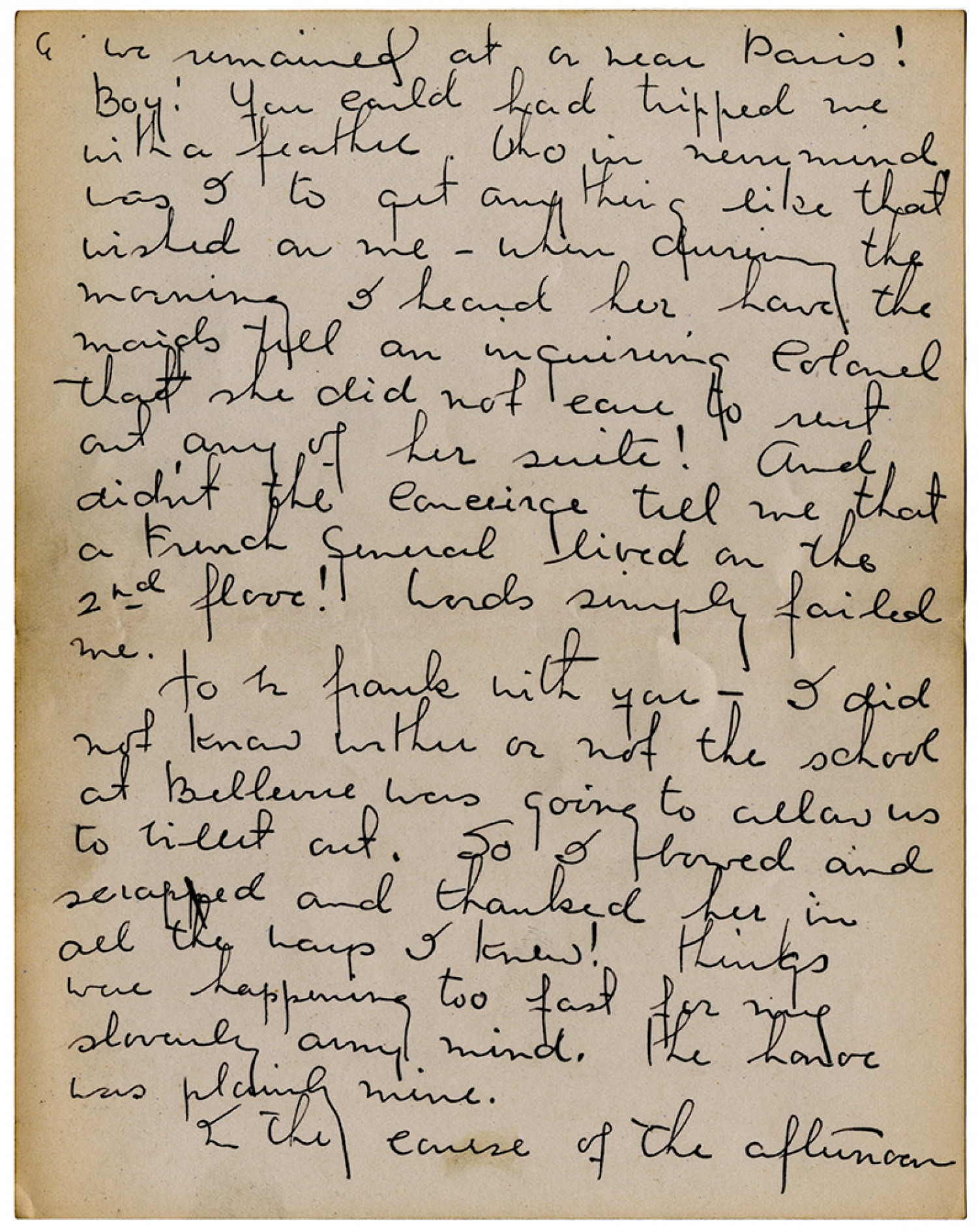 [page 6] we remained at or near Paris! Boy! You could had tripped me with a feather. Who in never mind was I to get any thing like that wished on me – when during the morning I heard her have the maids tell an inquiring Colonel that she did not care to rent out any of her suite! And didn’t the concierge tell me that a French general lived on the 2nd floor! Words simply failed me. to be frank with you - I did not know wether or not the school at Bellevue was going to allow us to billet out. So I bowed and scrapped and thanked her in all the ways I knew! things were happening too fast for my slovenly army mind. The honor was plainly mine. In the course of the afternoon