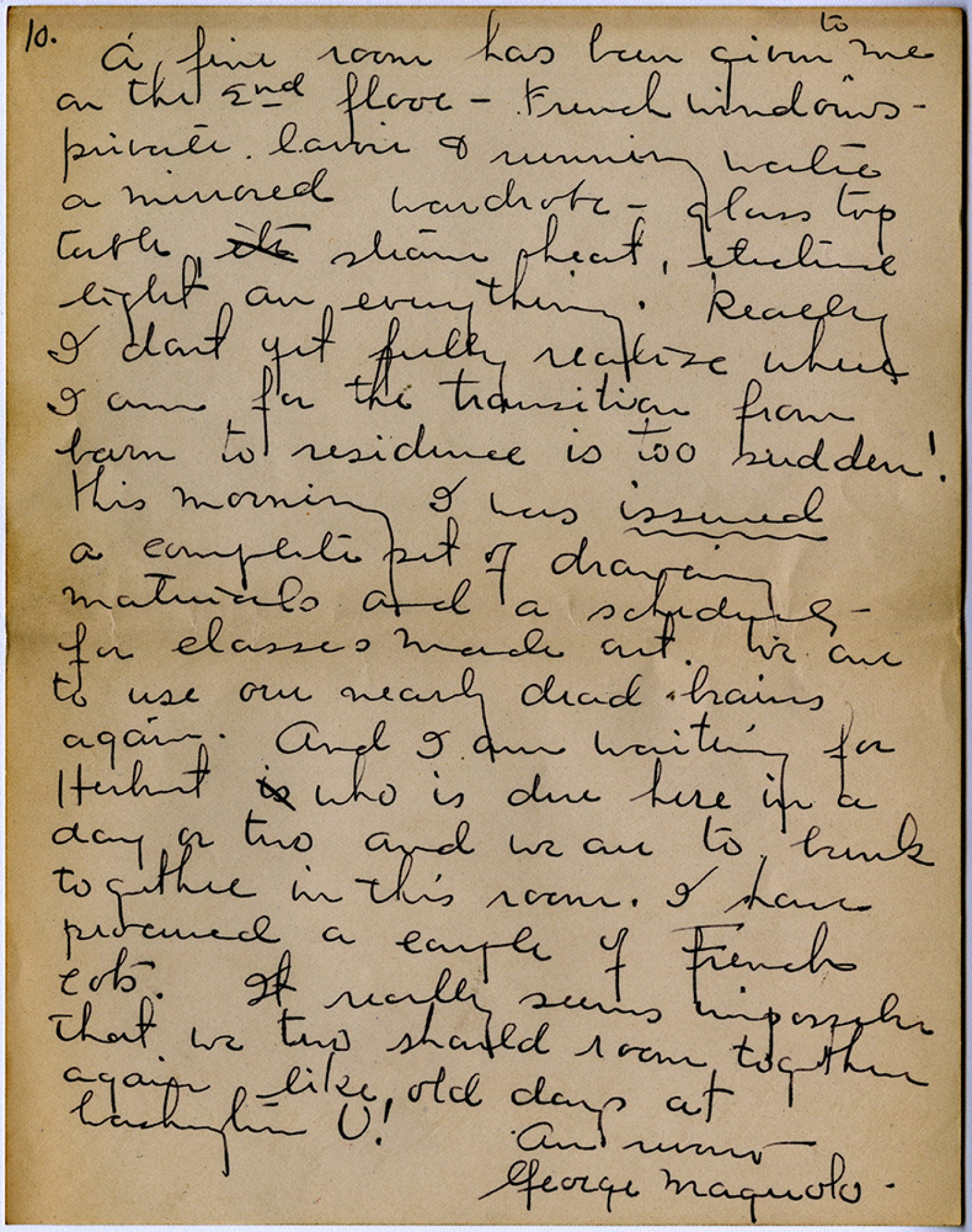 [page 10] A fine room has been given to me on the 2nd floor – French windows – private [ms illegible: 1 wd] & running water a mirrored wardrobe – glass top table steam heat, electric light on everything. Really I don’t yet fully realize where I am for the transition from barn to residence is too sudden! this morning I was issued a complete set of drawing materials and a schedule for classes made out. We are to use our nearly dead brains again. And I am waiting for Herbert who is due here in a day or two and we are to bunk together in this room. I have procured a couple of French cots. It really seems impossible that we two should room together again like old days at Washington [University]! Au revoir George Maguolo.