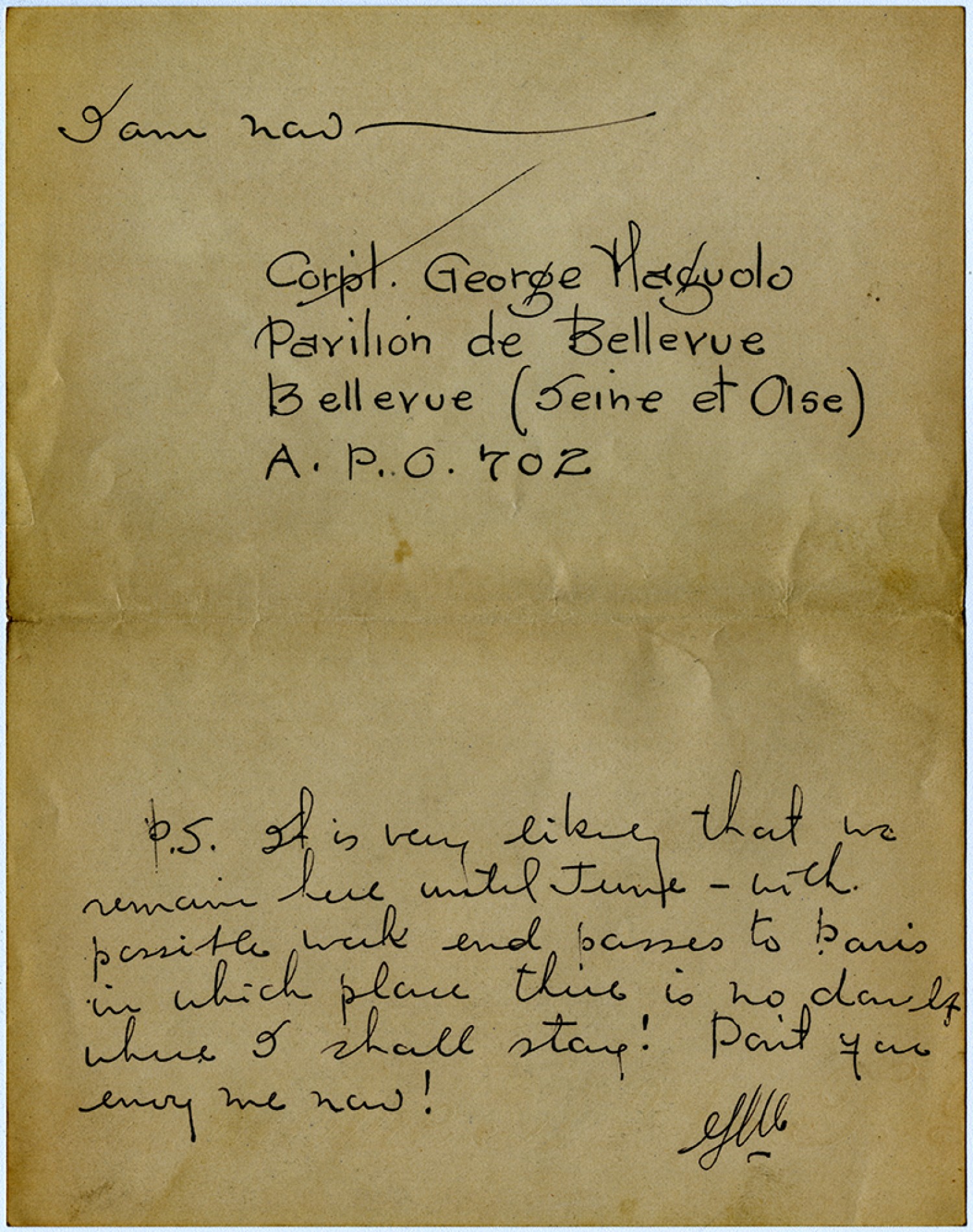 I am now - [Corporal] George Maguolo Pavilion de Bellevue Bellevue (Seine et Oise) A.P.O. 702 P.S. It is very likely that we remain here until June – with possible week end passes to Paris in which place there is no doubt where I shall stay! Don’t you envy me now! [George Maguolo]