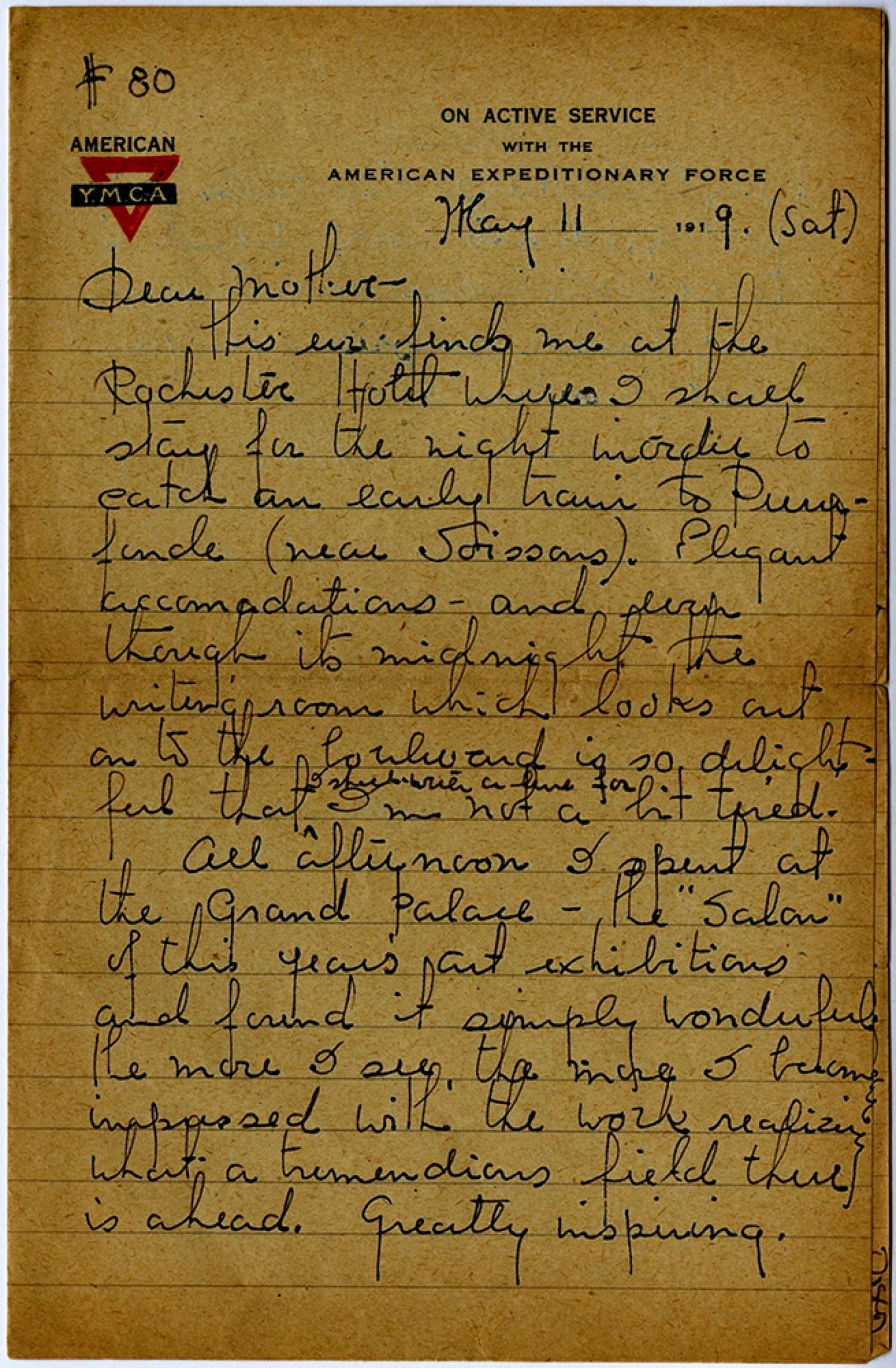 # 80 May 11, 1919 [Saturday] Dear Mother - this eve finds me at the Rochester Hotel where I shall stay for the night in order to catch an early train to Pierre – Fonde (near Soissons). Elegant accomodations – and even though its midnight the writing room which looks out on to the boulevard is so delightful that I shall write a line for I’m not a bit tired. All afternoon I spent at the Grand Palace – the ”Salon” of this year’s art exhibitions and found it simply wonderful. the more I see the more I become impressed with the work realizing what a tremendous field there is ahead. greatly inspiring.