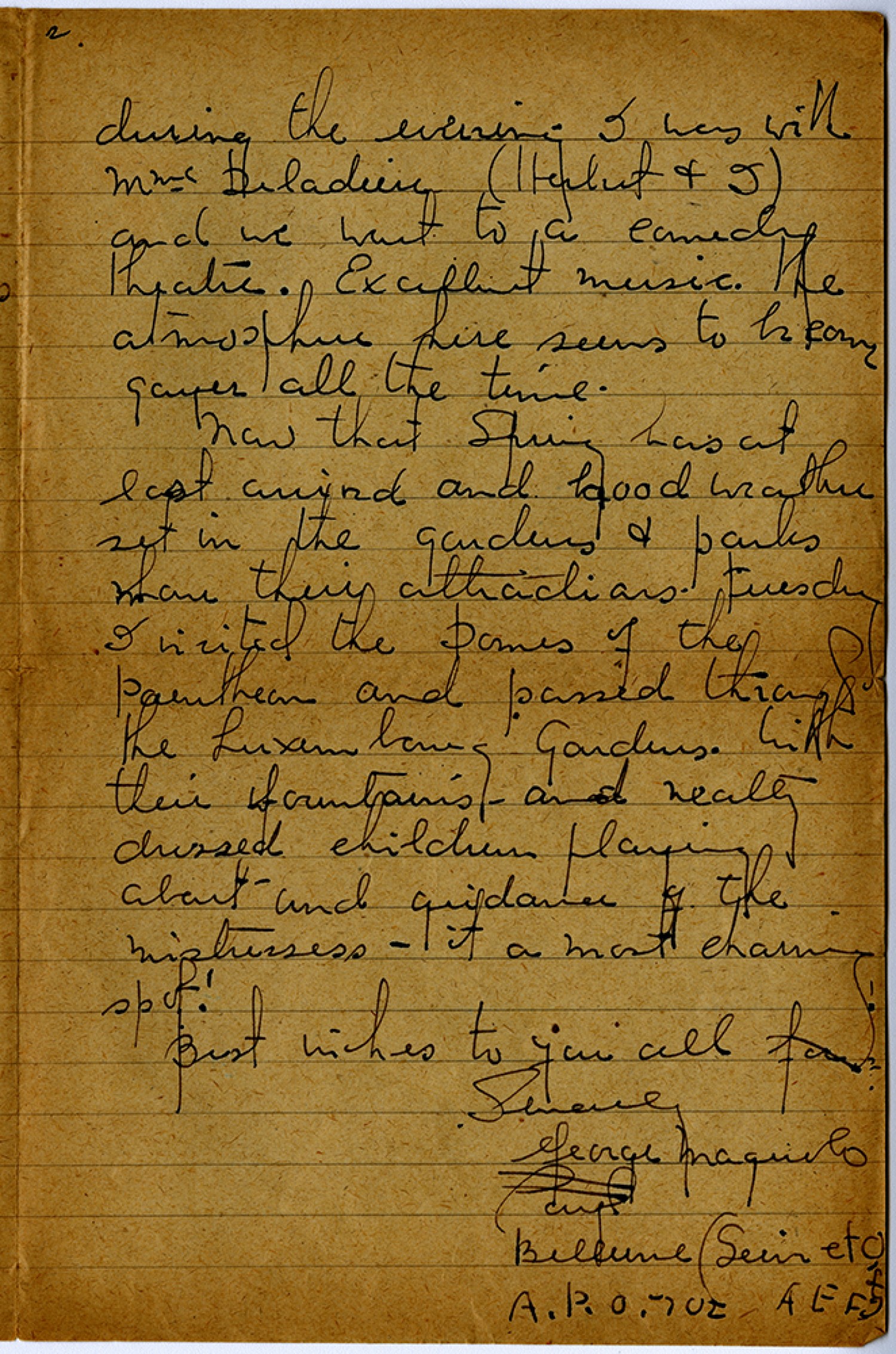 [page 2] during the evening I was with Mme Deldiere (Herbert & I) and we went to a comedy theatre. Excellent music. the atmosphere here seems to become gayer all the time. Now that Spring has at last arrived and good weather set in the gardens & parks have their attractions. tuesday I invited the Dames of the paentheon and passed through the Luxembourg gardens. With their fountains - and neatly dressed children playing about and guidance of the mistresses – it a most charming spot! Best wishes to you all Sincerely George Maguolo Bellevue (Seine et Oise) A.P.O. 702 A E F