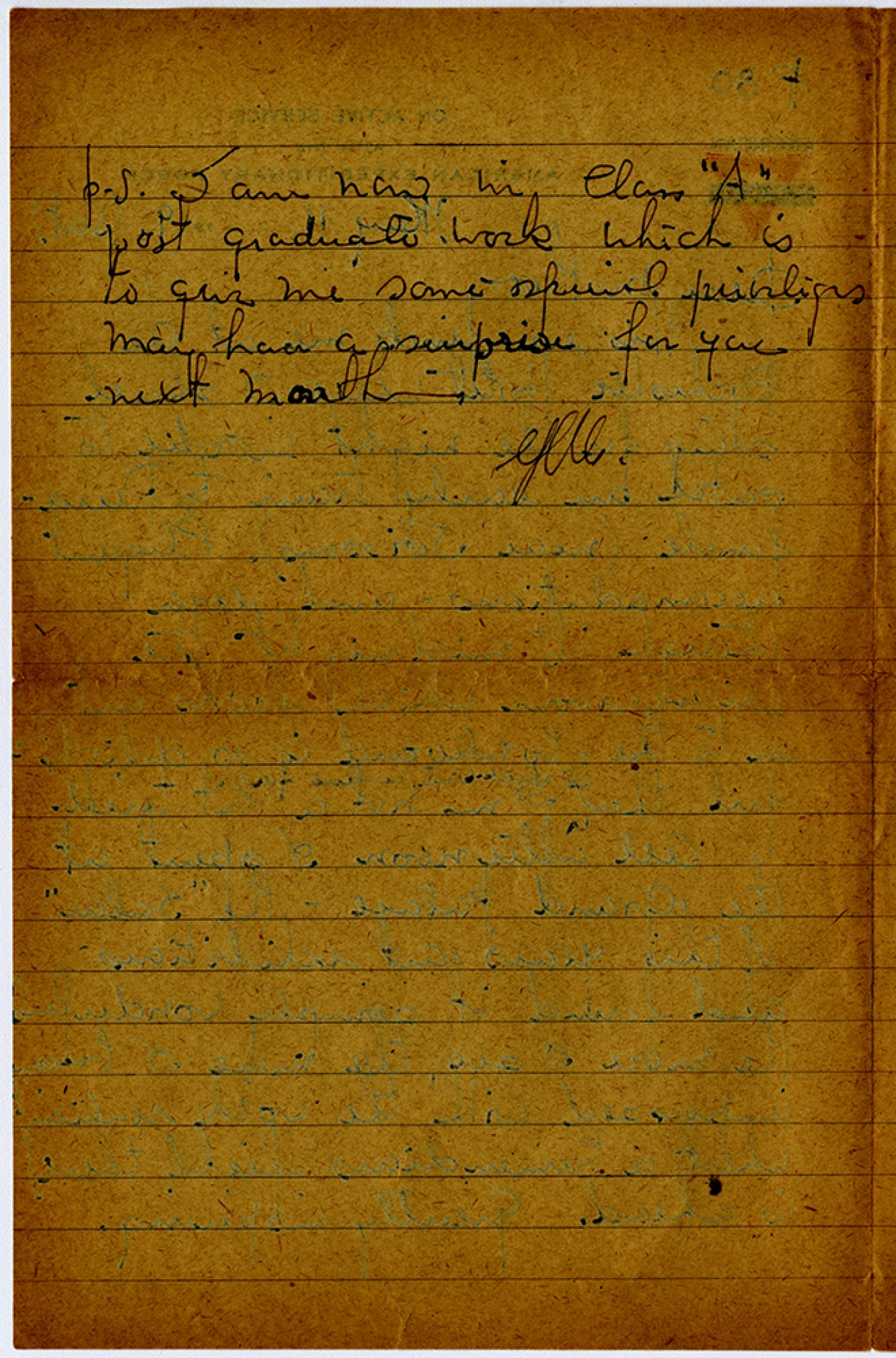 P.S. I am now in Class “A” post graduate work which is to give me some special priviliges May have a surprise for you next month. [George Maguolo]