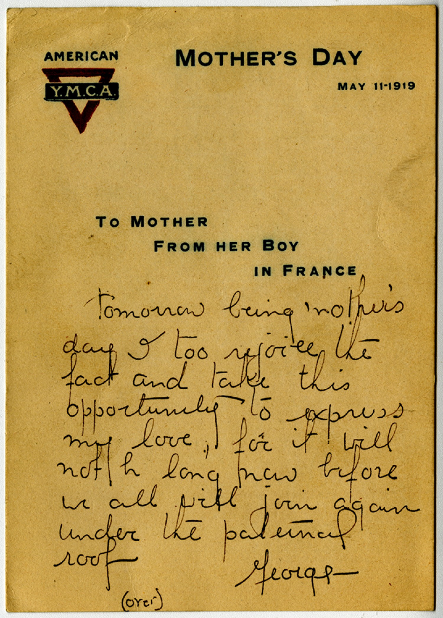 Mother’s Day May 11 - 1919 To Mother From Her Boy in France tomorrow being Mother’s day I too rejoice the fact and take this opportunity to express my love for it will not be long now before we all will join again under the paternal roof George - (over)