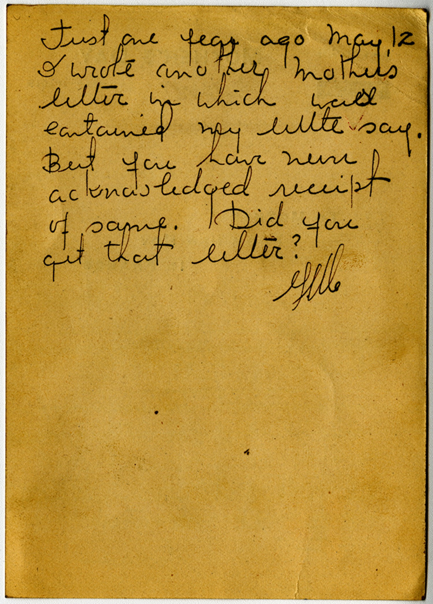 Just one year ago May 12 I wrote another Mother’s letter in which was contained little say. But you have never acknowledged receipt of same. Did you get that letter? [George Maguolo]