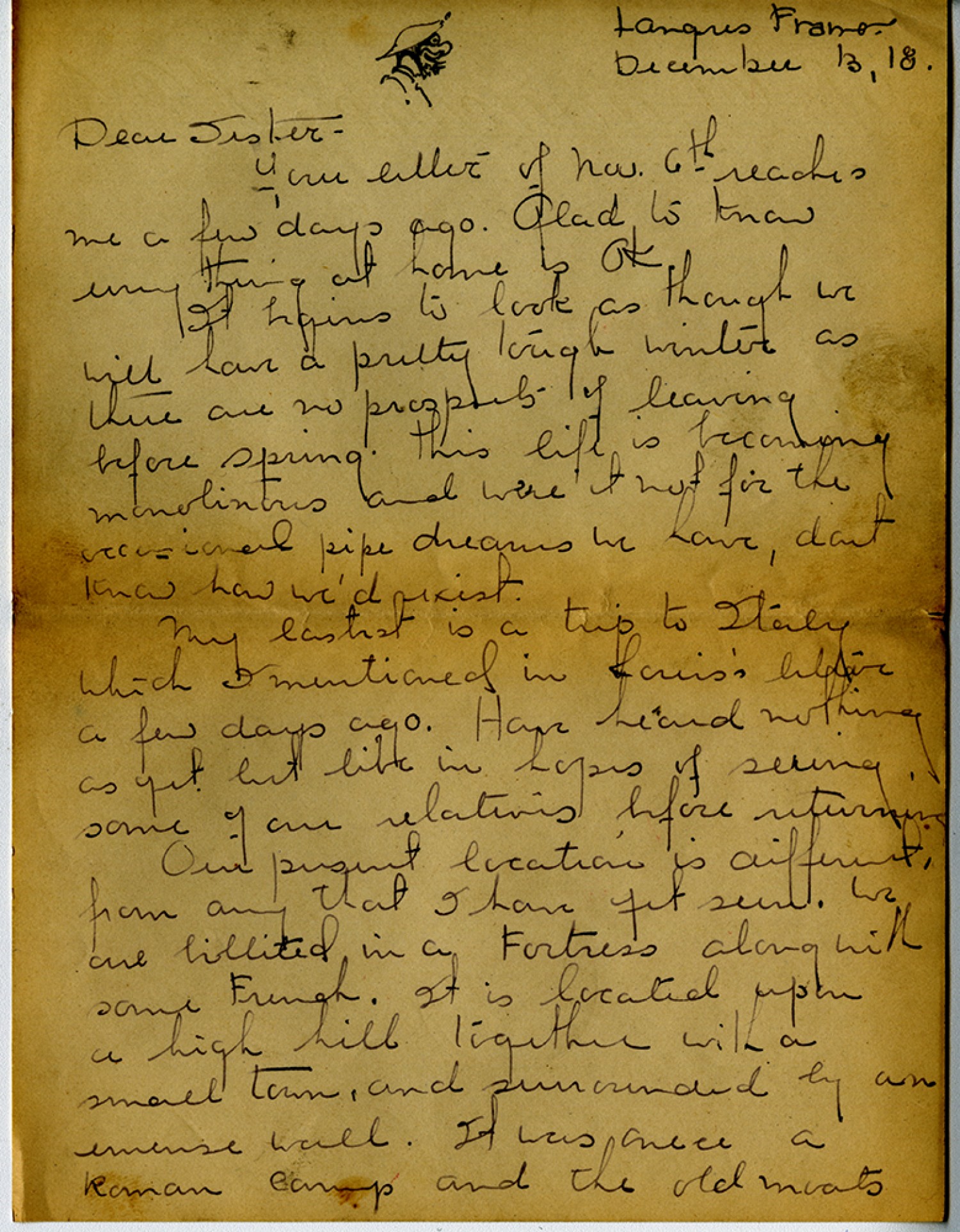 Langres France December 13, [1918] [small sketch of soldier] Dear Sister – Your letter of [November] 6th reached me a few days ago. Glad to know everything at home is OK. It begins to look as though we will have a pretty tough winter as there are no proposals of leaving before spring. this life is becoming monotinous and were it not for the occasional pipe dreams we have, dont know now how we’d exist. My latest is a trip to Italy which I mentioned in Louis’s letter a few days ago. Have heard nothing as yet but live in hopes of seeing some of our relatives before returning. Our present location is different, from any that I have yet seen. We are billeted in a Fortress along with some French. It is located upon a high hill together with a small town, and surrounded by an emense wall. It was once a Roman camp and the old moats