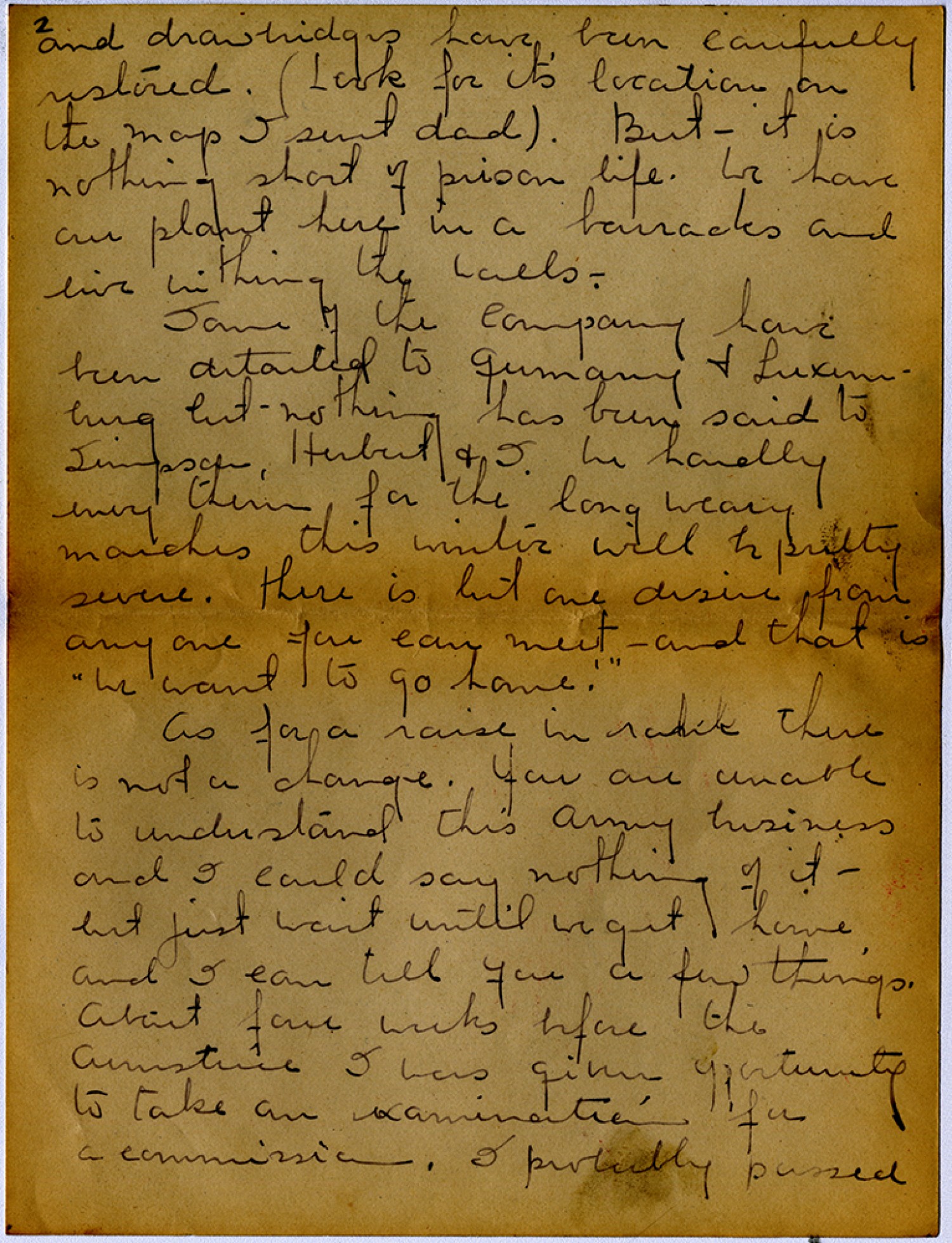 [page 2] and draw bridges have been carefully restored. (Look for its location on the map I sent dad). But – it is nothing short of prison life. We have our plant here in a barracks and live within the walls. Some of the company have been detailed to germany & Luxemburg but nothing has been said to Simpson, Herbert & I. We hardly envy them for the long weary marches this winter will be pretty severe. there is but one desire from any one you can meet – and that is “we want to go home.” As for a raise in rank there is not a change. You are unable to understand this Army business and I could say nothing of it – but just wait until we get home, and I can tell you a few things. About four weeks before the Armistice I was given opportunity to take an examination for a commission. I probably passed