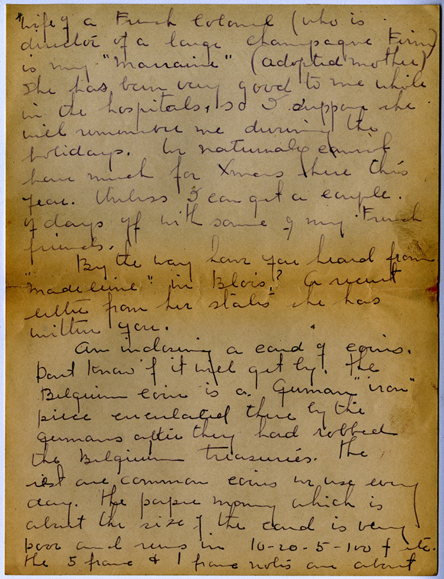 wife of a French Colonel (who is director or a large Champagne Firm) is my “Morraine” (adopted mother) She has been very good to me while in the hospitals, so I suppose she will remember me during the holidays. We naturally cannot have much for Xmas here this year. Unless I can get a couple days off with some of my French friends. By the way have you heard from ”Madeline” in Blois? A recent letter from her states she has written you. Am inclosing a card of coins. Dont know if it will get by the Belgian coin is a german “iron” piece circulated there by the germans after they had robbed the Belgian treasuries. The rest are common coins we use every day. the paper money which is about the size of the card is very poor and runs in 10-20-5-100 + etc. The 5 franc & 1 franc notes are about