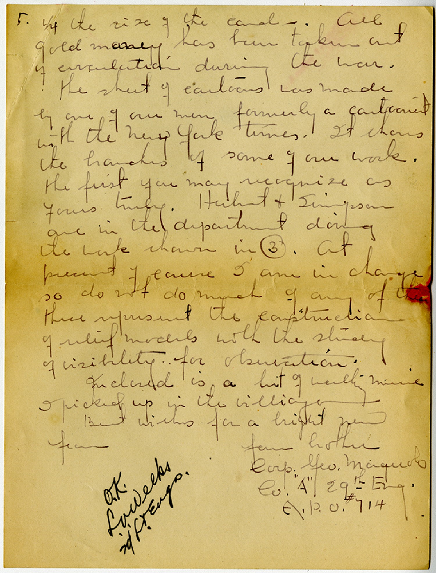 [page 5] ¼ the size of the card - . All gold money has been taken out of circulation during the war. The sheet of cartoons was made by one of our men formerly a cartoonist with the New York Times. It shows the branches of some of our work. the first you may recognize as yours truly. Herbert & Simpson are in the department doing the work shown in 3. At present of course I am in charge so do not do much of any of this. These represent the construction of relief models with the study of visibility for observation. Inclosed is a bit of [ms illegible: 2 wds] I picked up in the village Best wishes for a bright new year. Your brother [Corporal] [George] Maguolo Co. “A” 29th [Engineers] A. P. O. #714 [censor’s signature]