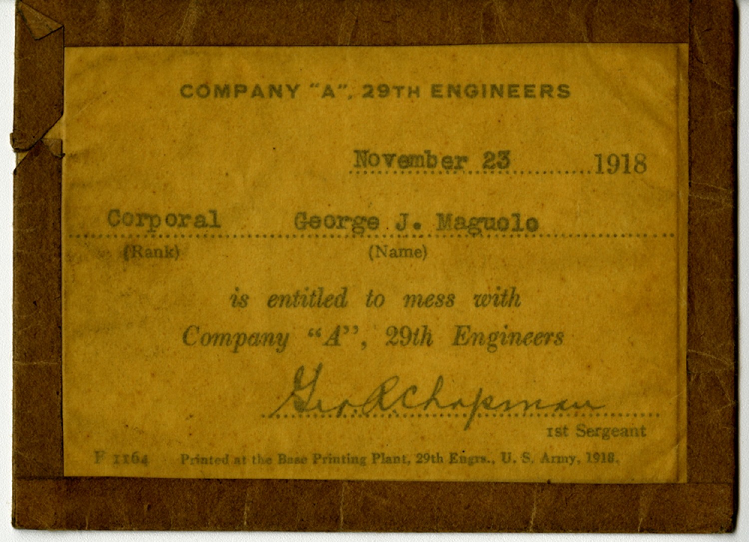 COMPANY “A”, 29th Engineers November 23 1918 (Rank) Corporal (Name) George J. Maguolo is entitled to mess with Company “A”, 29th Engineers [signature] [George] R Chapman 1st Sergeant F 1164 Printed at the Base Printing Plant, 29th Engrs., U.S. Army, 1918.