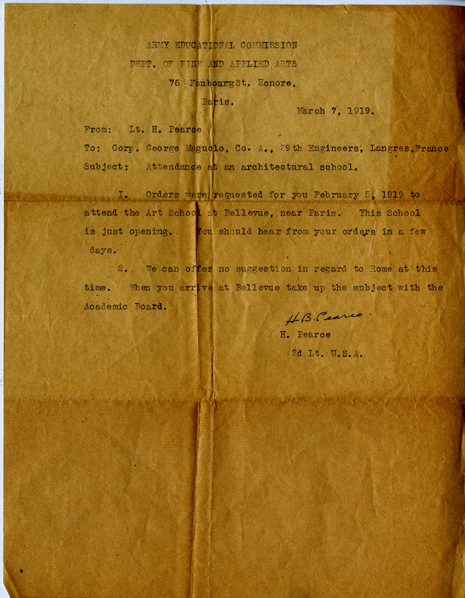 ARMY EDUCATIONAL COMMISSION DEPT. OF FINE AND APPLIED ARTS 76 Faubourg St. Honore, Paris. March 7, 1919. From: Lt H. Pearce To: Corp. George Maguolo, Co. A., 29th Engineers, Langres, France Subject: Attendance at an architectural school. I. Orders were requested for you February 5, 1919 to attend Art School at Bellevue, near Paris. This School is just opening. You should hear from your orders in a few days. 2. We can offer no suggestion in regard to Rome at this time. When you arrive at Bellevue take up the subject with the Academic Board. [signature] H. Pearce 2d Lt. U.S.A.