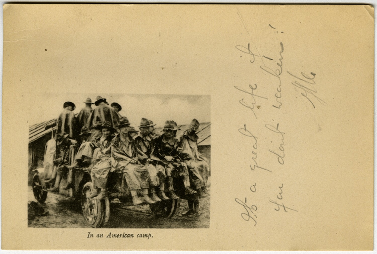 [postcard with photo] In an American camp. [written in margin] Its a great life if you dont weaken! [George Maguolo]