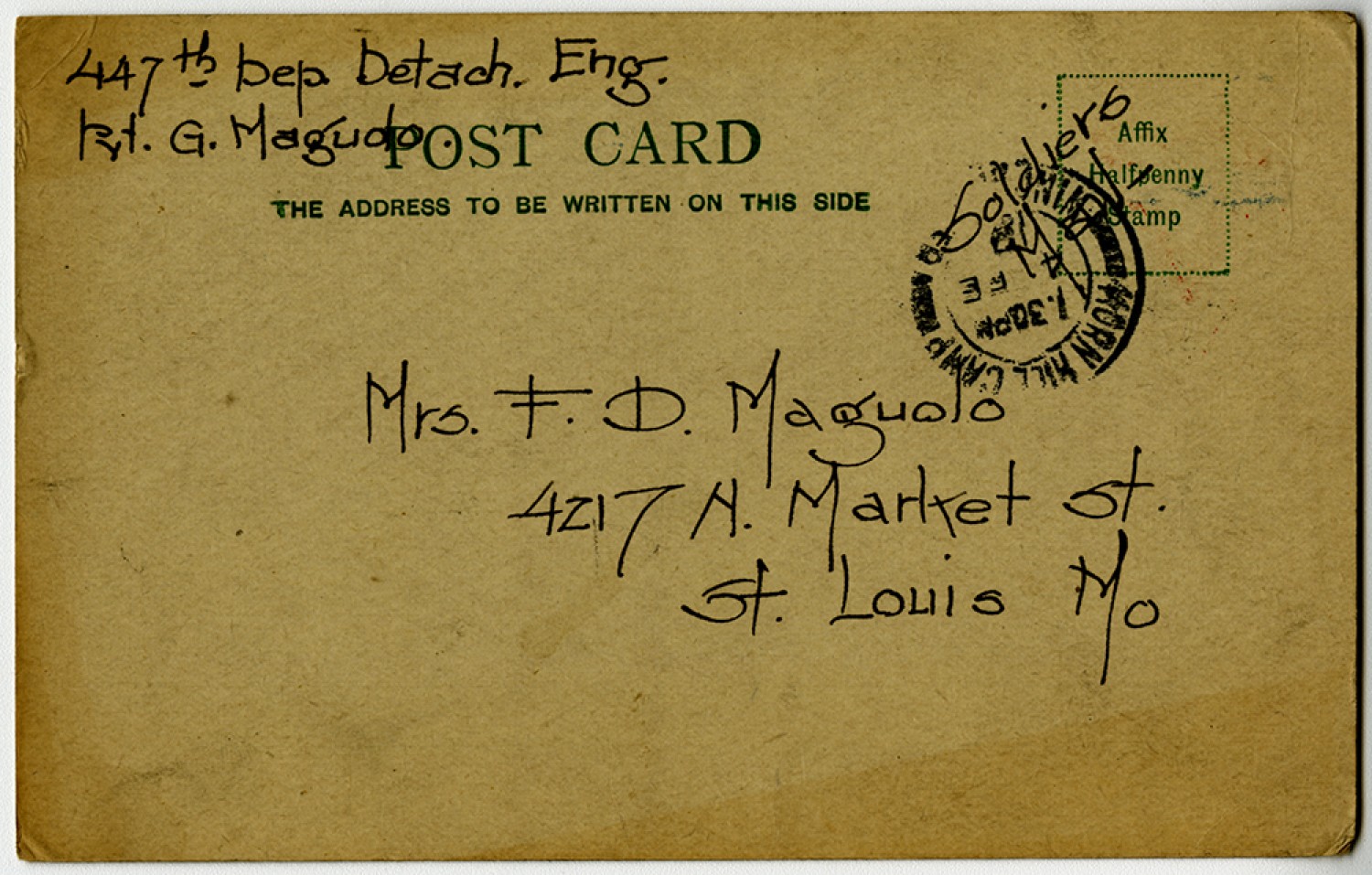 447th [Depot Detachment Engineers] Pvt Maguolo Mrs. F. D. Maguolo 4217 [North] Market [Street] St. Louis [Missouri]