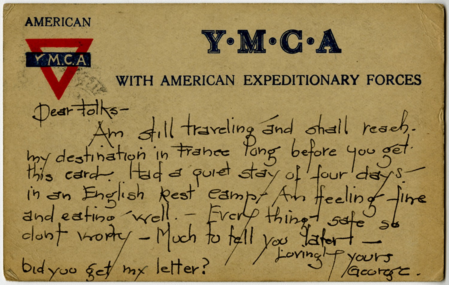Dear Folks – Am still traveling and shall reach my destination in France long before you get this card. Had a quiet stay of four days in an English Rest camp – Am feeling fine and eating well – Every thing – safe so dont worry - Much to tell you later – Lovingly yours George. Did you get my letter?