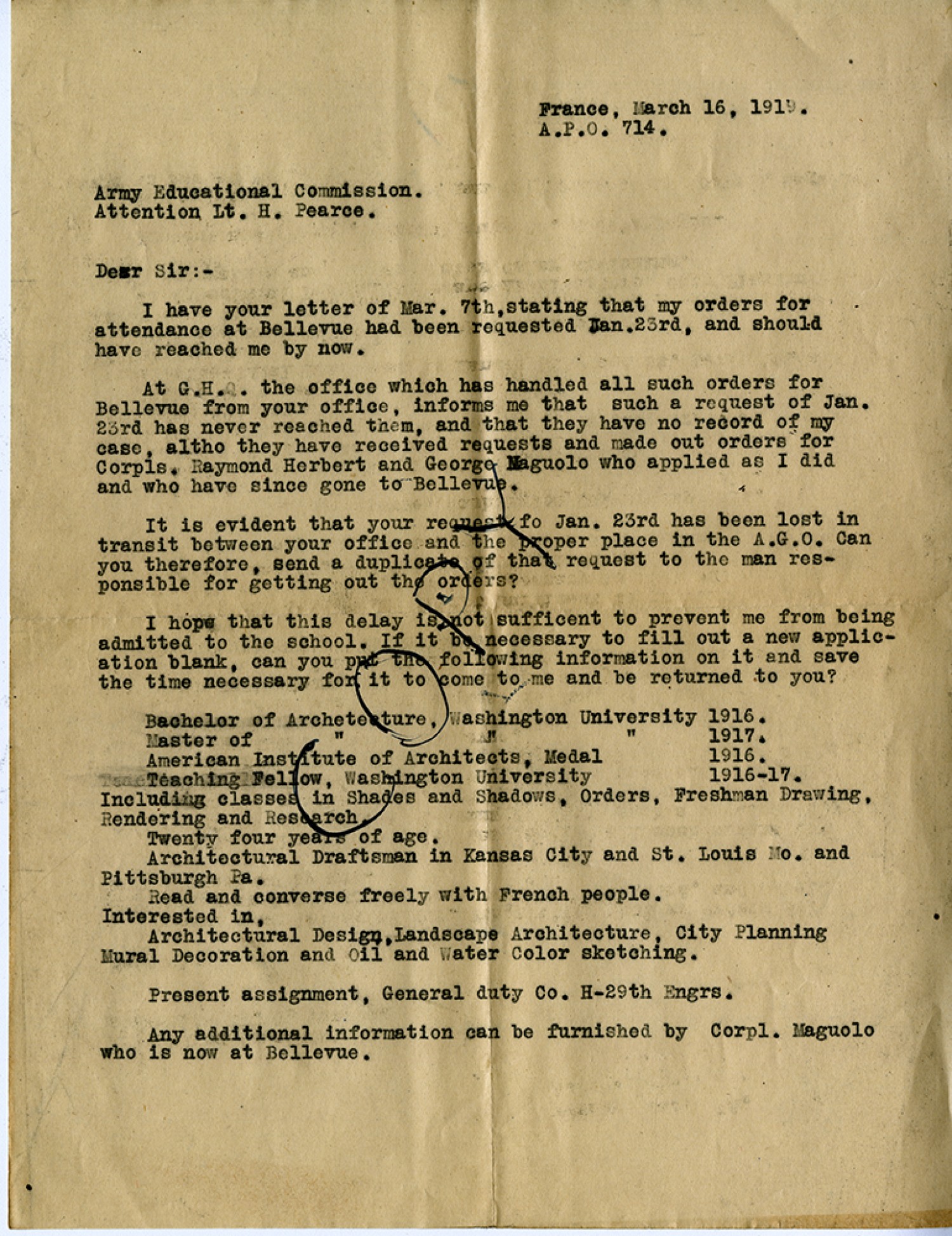 COPY France ,March 16, 1919. A. P. O. 714. Army Educational Commission Attention Lt. H. Pearce. Dear Sir: - I have your letter of [March] 7th, stating that my orders for attendance at Bellevue had been requested [January] 23rd, and should have reached me by now. At G.H.Q. the office which has handled all such orders for Bellevue from your office, informs me that such a request of [January] 23rd has never reached them, and that they have no record of my case, altho they have received requests and made out orders for Corpls. Raymond Herbert and George Maguolo who applied as I did and who have since gone to Bellevue. It is evident that your request of [January] 23rd has been lost in transit between your office and the proper place in the A.G.O. Can you therefore, send a duplicate of that request to the man responsible for getting out the orders? I hope that this delay is not sufficient to prevent me from being admitted to the school. If it be necessary to fill out a new application blank, can you put the following information on it and save the time necessary for it to come to me and be returned to you? Bachelor of Archetecture,Washington University 1916. Master of [Architecture, Washington University] 1917. American Institute of Architects, Medal 1916. Teaching Fellow, Washington University 1916-17. Including classes in Shades and Shadows, Orders, Freshman Drawing, Rendering and Research. Twenty four years age. Architectural Draftsman in Kansas City and St. Louis [Missouri] and Pittsburgh [Pennsylvania]. Read and converse freely with French people. Interested in, Architectural Design, Landscape Architecture, City Planning Mural Decoration and Oil and Water Color sketching. Present assignment, General duty Co. H-29th Engrs. Any additional information can be furnished by Corpl. Maguolo who is now at Bellevue.