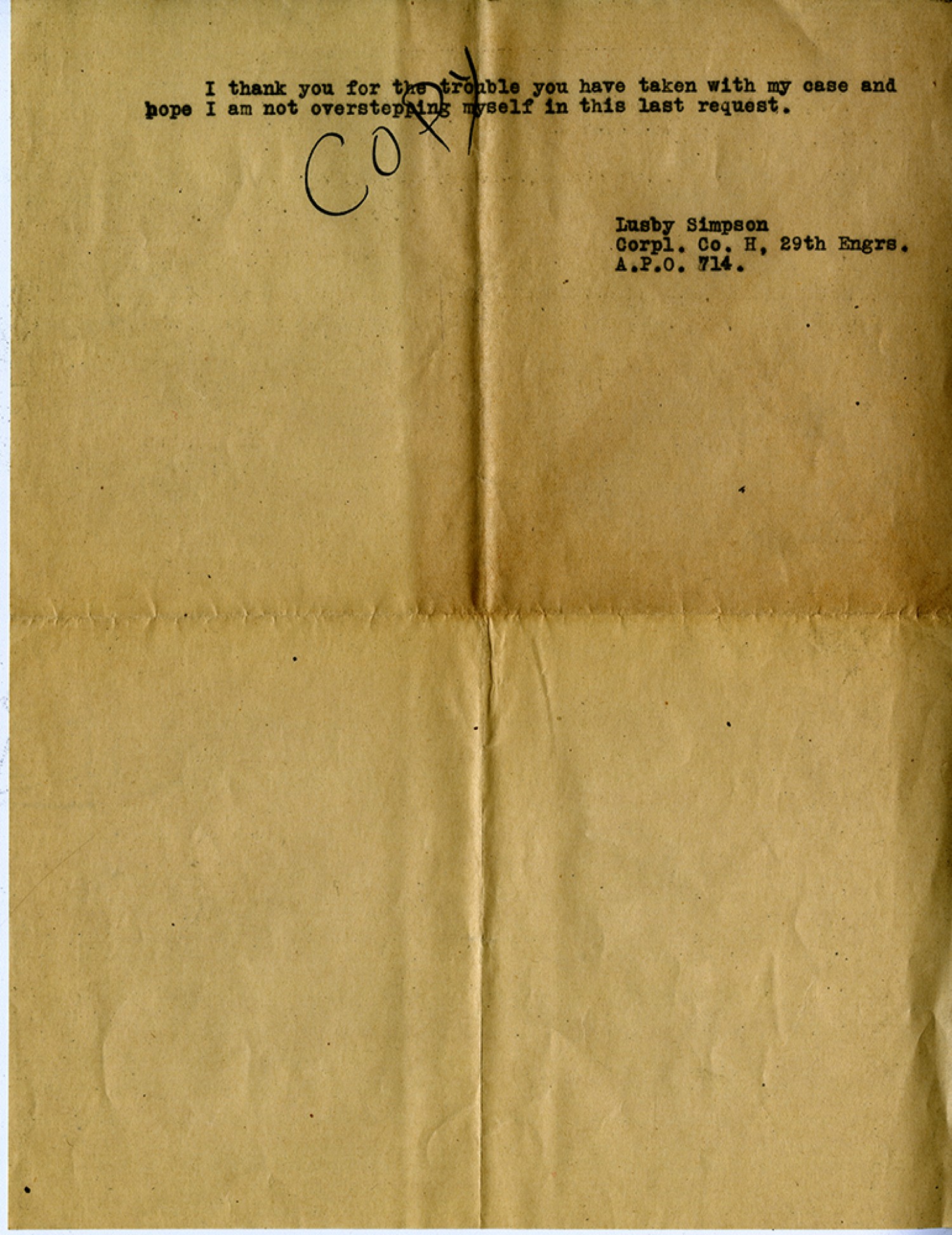 COPY I thank you for the trouble you have taken with my case and hope I am not over stepping myself in this last request. Lusby Simpson, Corpl. Co. H, 29th Engrs. A.P.O. 714.
