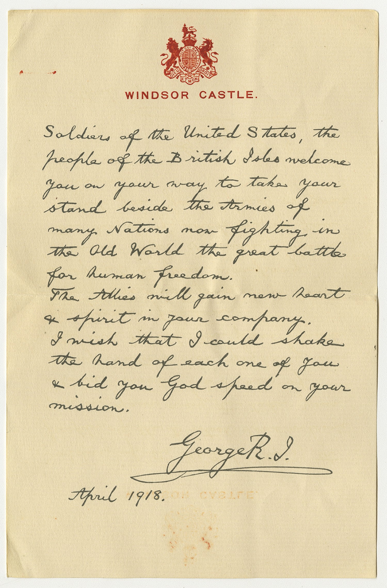 [letterhead] Windsor Castle. Soldiers of the United States, the people of the British Isles welcome you on your way to take your stand beside the Armies of many Nations now fighting in the Old World the great battle for human freedom. The Allies will gain new heart & spirit in your company. I wish that I could shake the hand of each one you & bid you God speed on your mission. George R.I. April 1918.