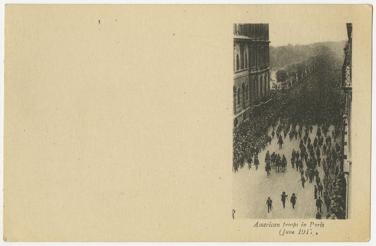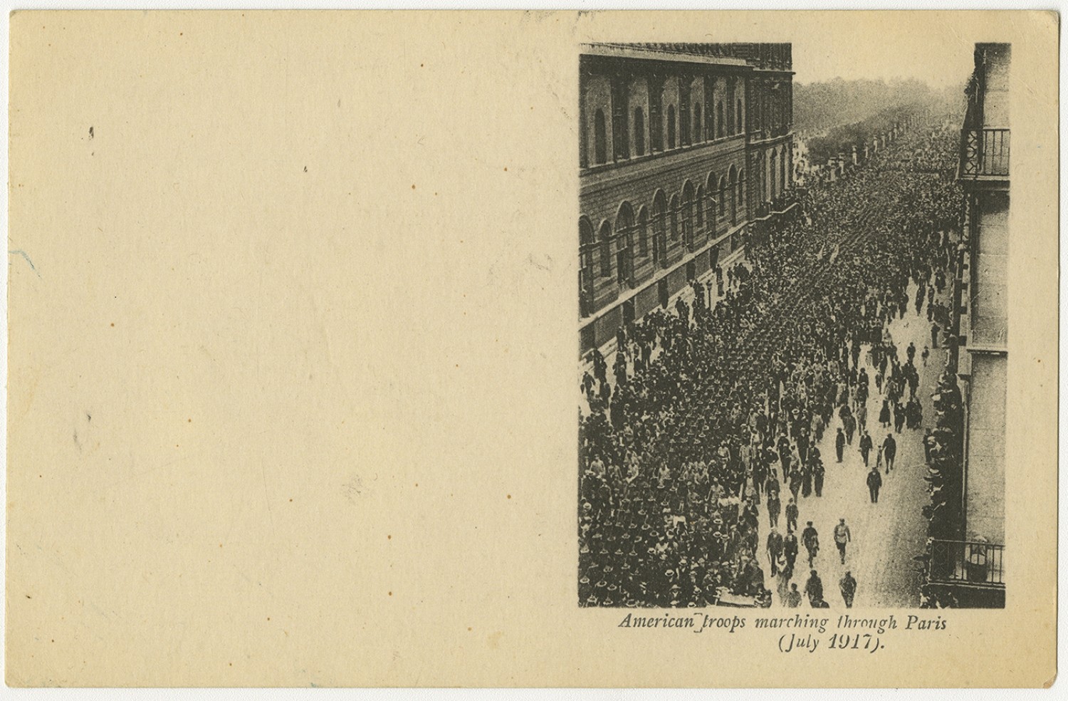| Description | A photographic postcard showing American troops marching through Paris. |
