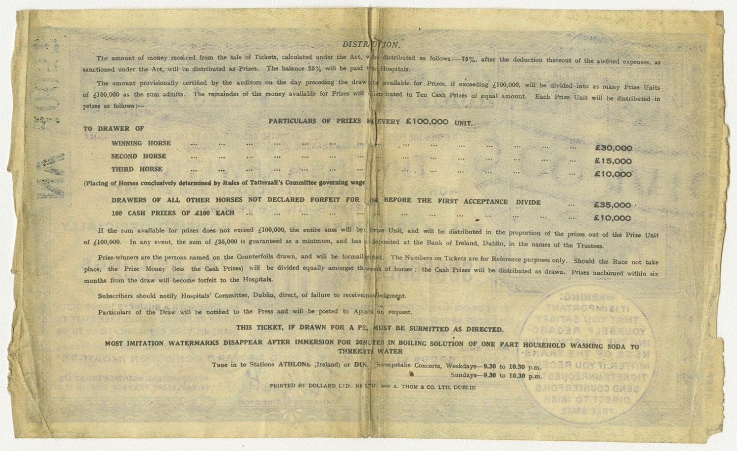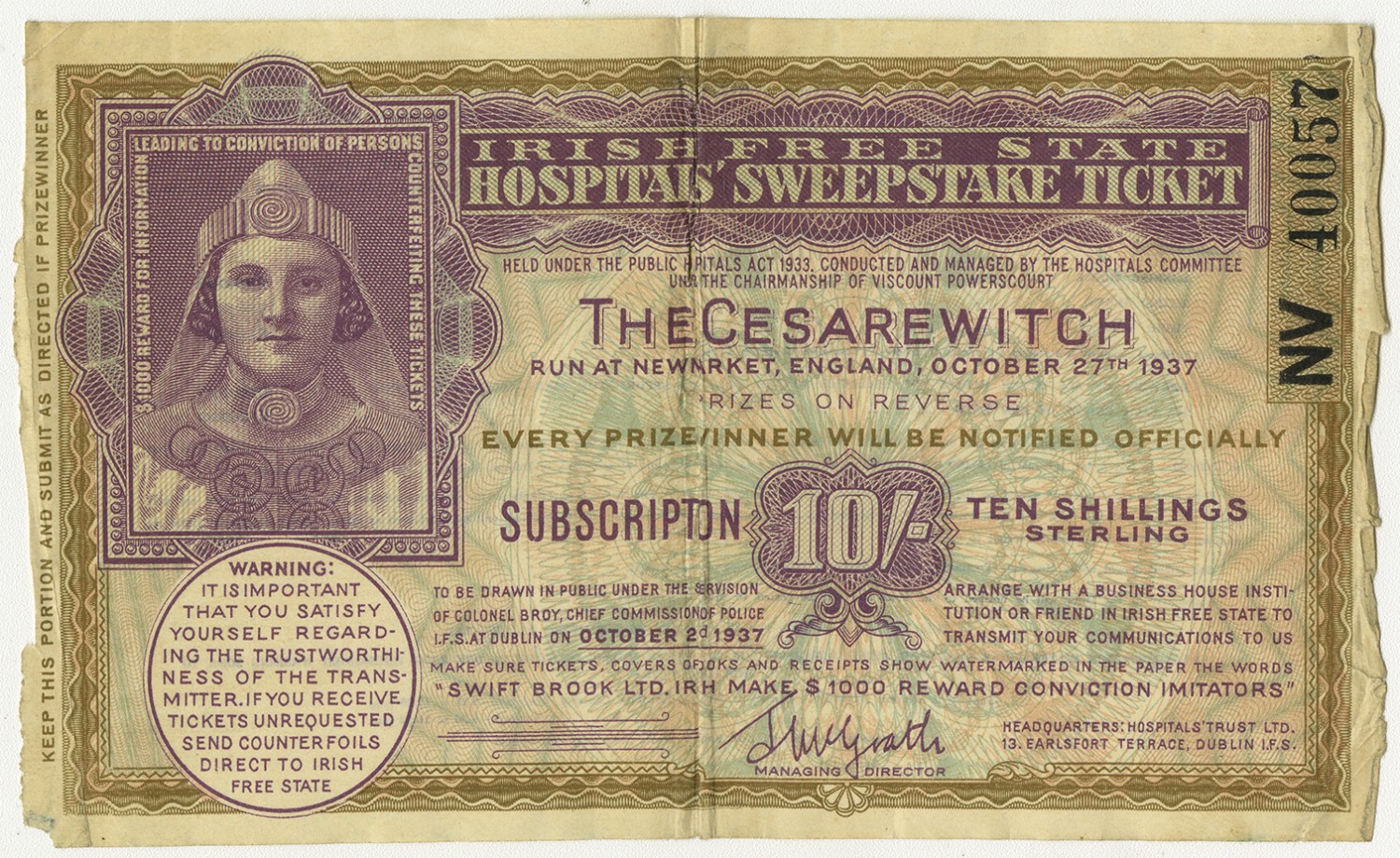 | Description | Irish Free State hospital's sweepstake ticket for the Ceasarewitch at New Market, England. |