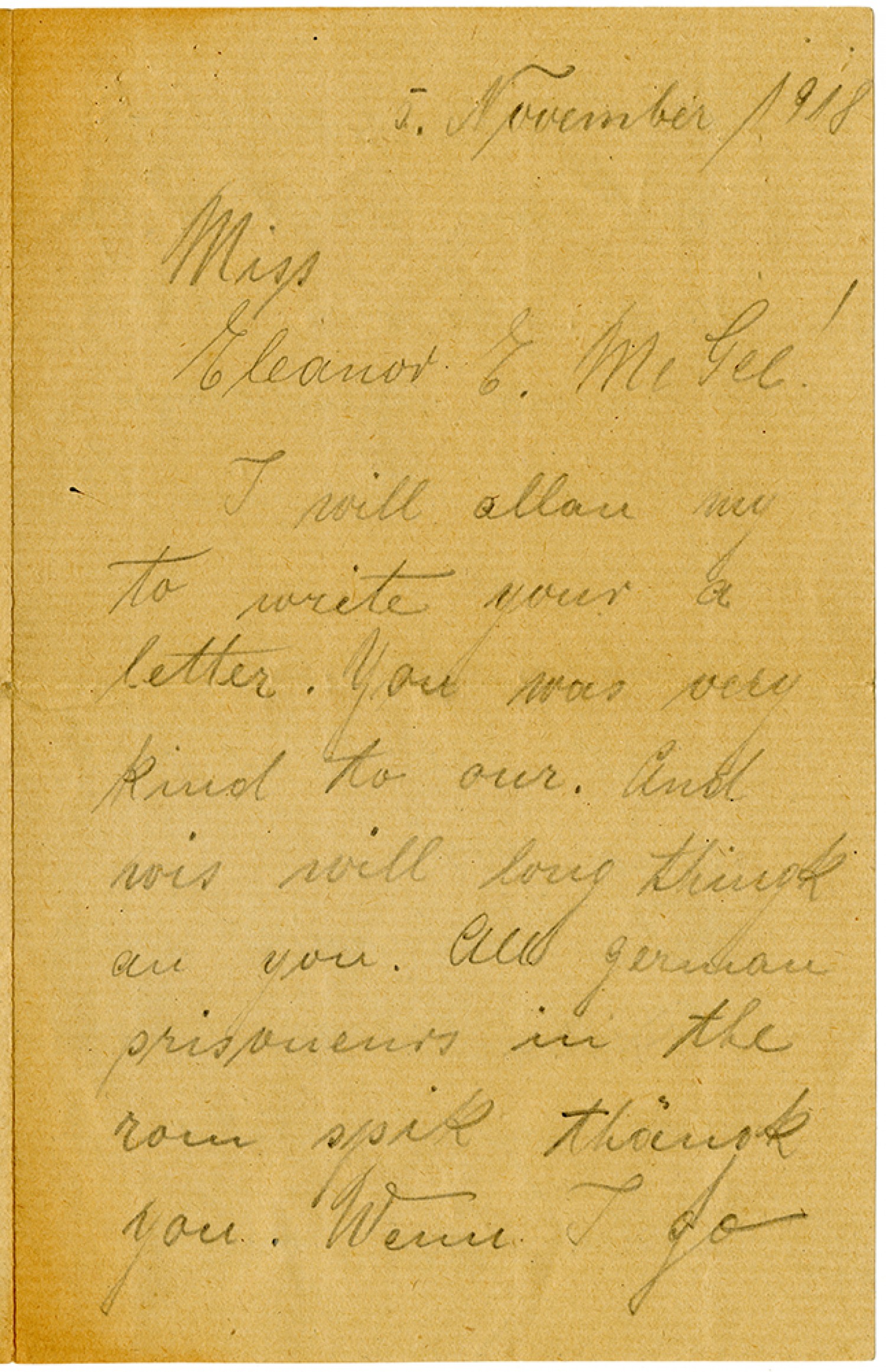 [November 5, 1918] Miss Eleanor E. McGee! I will allow my to write your a letter. You was very kind to our. And wis will long thingk au you. All german prisoneurs in the rom spik thoingk you. Wenn I go