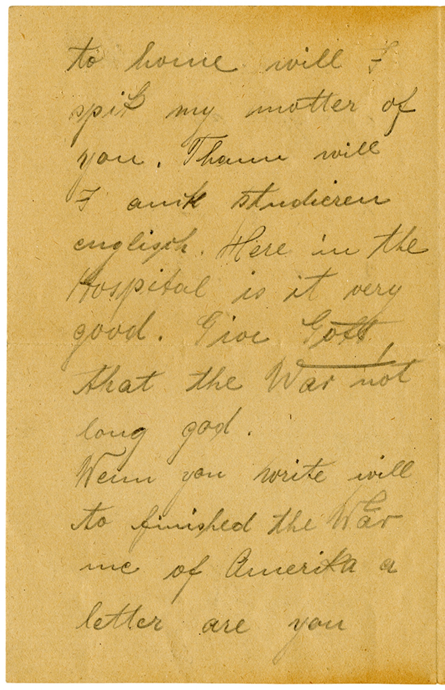 to home will I spik my mother of you. Thenn will I amte studieren englisch. Here in the Hospital is it very good. Give Gott that the War not long god. Wenn you write will to finished the War me of Amerika a letter are you