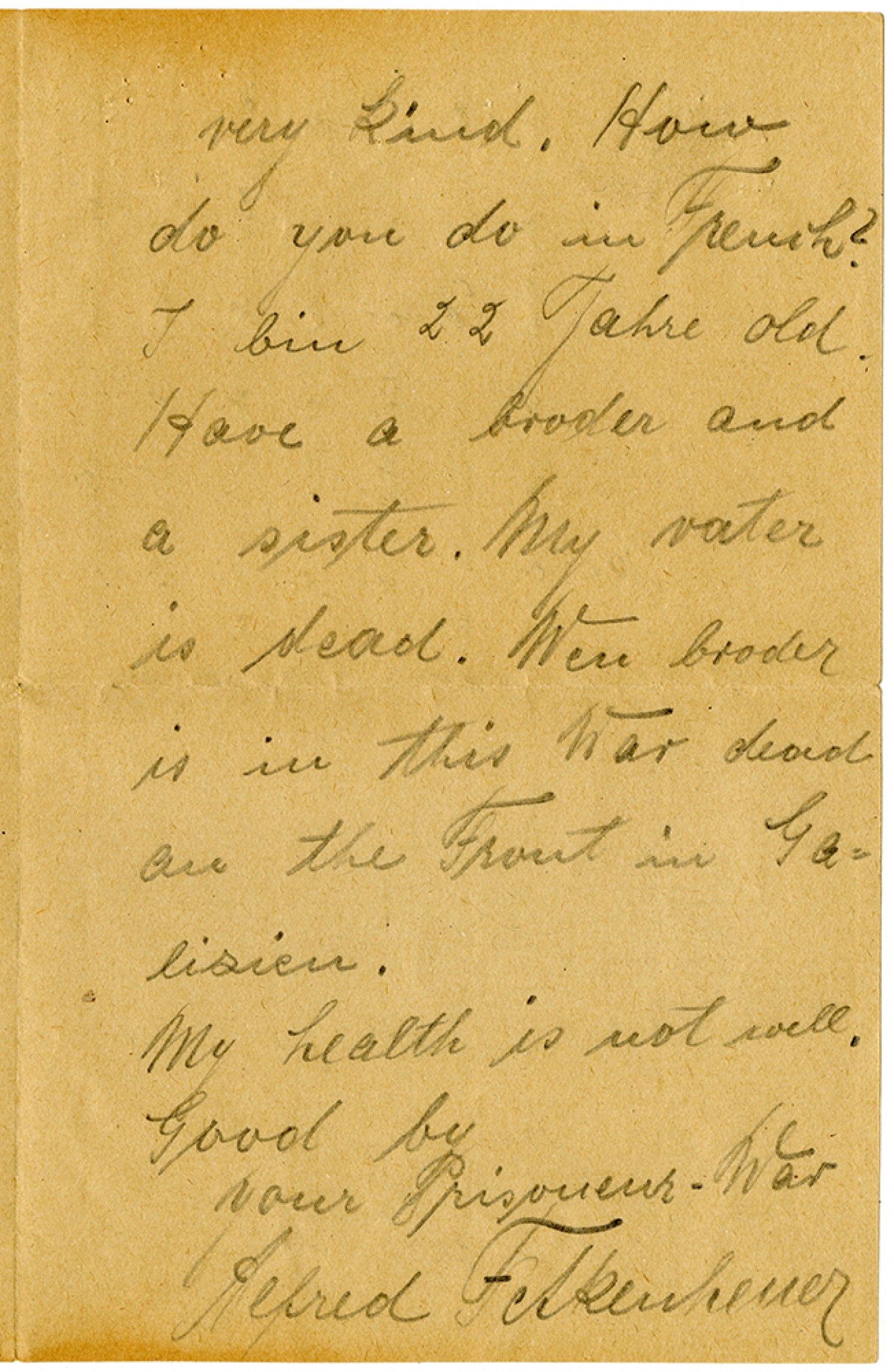 very kind. How do you do in French? I bin 22 Jahre old. Have a broder and sister. My vater is dead. Wen broder is in this War dead au the Front in [Galicia]. My health is not well. Good by your Prisoneur-War Alfred Felkenheuer