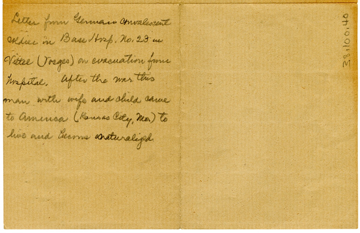Letter from German convalescent soldier in Base [Hospital] No. 23 in Vittel (Vosges) on evacuation from hospital. After the war this man with wife and child came to America (Kansas City, [Missouri]) to live and became naturalized.