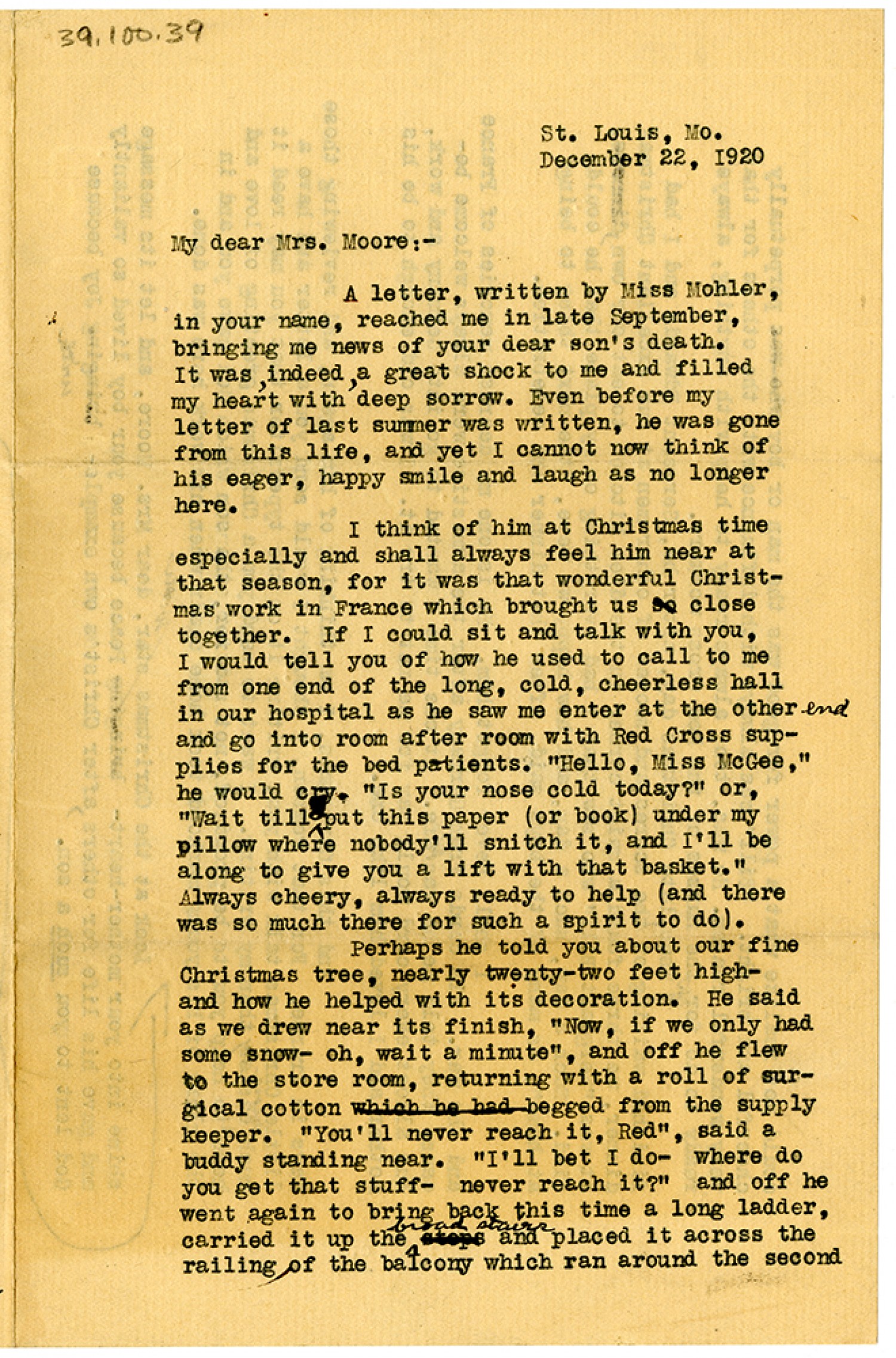 St. Louis, Mo. December 22, 1920 My Dear Mrs. Moore:- A letter, written by Miss Mohler, in your name, reached me in late September, bringing me news of your dear son's death. It was, indeed, a great shock to me and filled my heart with deep sorrow. Even before my letter of last summer was written, he was gone from this life, and yet I cannot now think of his eager, happy smile and laugh as no longer. I think of him at Christmas time especially and shall always feel him near at that season, for it was that wonderful Christmas work in France which brought close together. If I could sit and talk with you, I would tell you of how he used to call to me from one end of the long, cold, cheerless hall and go into room after room with Red Cross supplies for the bed patients. "Hello, Miss McGee," he would cry. "Is your nose cold today?" or, "Wait till I put this paper (or book) under my pillow where nobody'll snitch it, and I'll be along to give you a lift with that basket." Always cheery, always ready to help (and there was so much there for such a spirit to do). Perhaps he told you about our fine Christmas tree, nearly twenty-two feet high and how he helped with its decoration. He said as we drew near its finish, "Now, if we only had some snow- oh, wait a minute", and off he flew to the store room, returning with a roll of surgical cotton begged from the supply keeper. "You'll never reach, Red", said a buddy standing near. "I'll bet I do- where do you get that stuff- never reach it?" and off he went again to bring back this time a long ladder, carried it up the broad stairs and placed it across the railing of the balcony which ran around the second