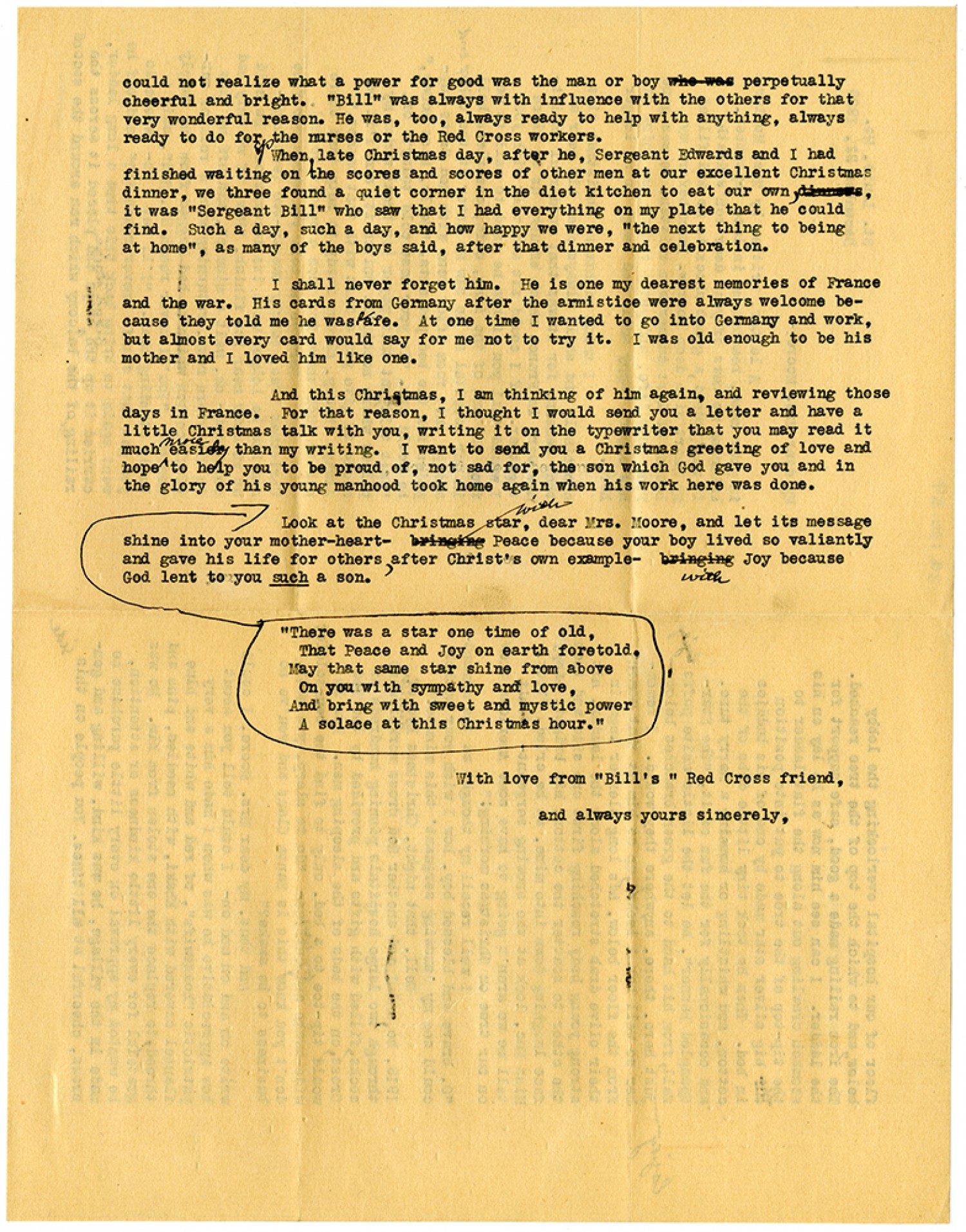 could not realize what a power for good was the man or boy perpetually cheerful and bright. "Bill" was always with influence with the others for that very wonderful reason. He was, too, always ready to help with anything, always ready to do for the nurses or the Red Cross workers. When, late Christmas day, after he, Sergeant Edwards and I had finished waiting on the scores and scores of other men at our excellent Christmas dinner, we three found a quiet corner in the diet kitchen to eat our own, it was "Sergeant Bill" who saw that I had everything on my plate that he could find. Such a day, such a day, and how happy we were, "the next thing to being at home", as many of the boys said, after that dinner and celebration. I shall never forget him. He is one my dearest memories of France and the war. His cards from Germany after the armistice were always welcome because they told me he was safe. At one time I wanted to go into Germany and work, but almost every card would say for me not to try it. I was old enough to be his mother and I loved him like one. And this Christmas, I am thinking of him again, and reviewing those days in France. For that reason, I thought I would send you a letter and have a little Christmas talk with you, writing it on the typewriter that you may read it much more easily than my writing. I want to send you a Christmas greeting of love and hope to help you to be proud of, not sad for, the son which God gave you and in the glory of his young man hood took home again when his work here was done. "There was a star one time of old, That Peace and Joy on earth foretold. May that same star shine from above On you with sympathy and love, And bring with sweet and mystic power A solace at this Christmas hour." Look at the Christmas star, dear Mrs. Moore, and let its message shine into your mother-heart- wish Peace because your boy lived so valiantly and gave his life for others, after Christ's own example- with Joy because God lent to you such a son. With love from "Bill's" Red Cross friend, and always your sincerely,