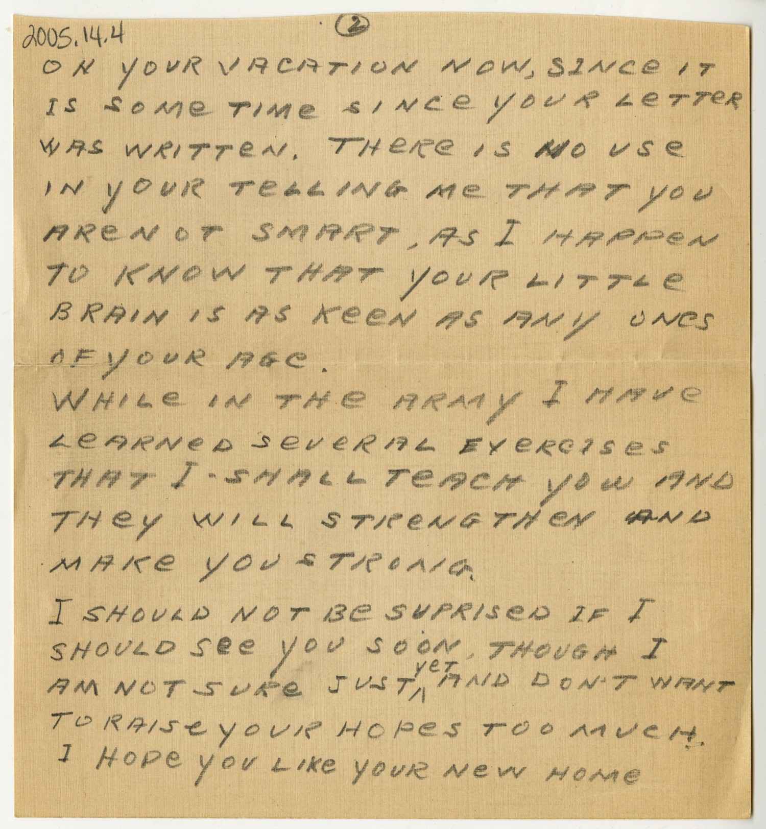[page 2] ON YOUR VACATION NOW, SINCE IT IS SOME TIME SINCE YOUR LETTER WAS WRITTEN. THERE IS NO USE IN YOUR TELLING ME THAT YOU ARE NOT SMART, AS I HAPPEN TO KNOW THAT YOUR LITTLE BRAIN IS AS KEEN AS ANY ONES OF YOUR AGE. WHILE IN THE ARMY I HAVE LEARNED SEVERAL EXERCISES THAT I SHALL TEACH YOU AND THEY WILL STRENGTHEN AND MAKE YOU STRONG. I SHOULD NOT BE SURPRISED IF I SHOULD SEE YOU SOON, THOUGH I AM NOT SURE JUST YET AND DON