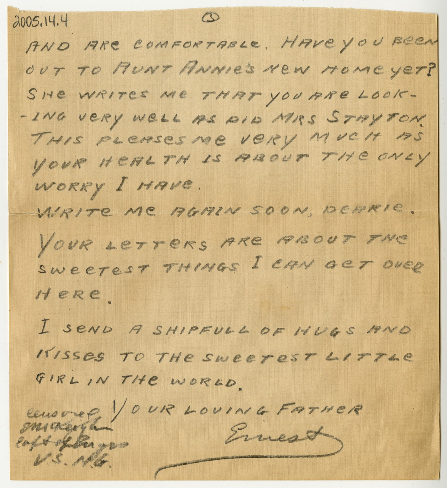 [page 1] FRANCE JULY 21 [1918] MY SWEET LITTLE DAUGHTER I WAS SO VERY MUCH PLEASED TO GET THE LETTER YOU WROTE MAY 22ND DEAR LITTLE HEART, I KNOW YOU ARE LONESOME FOR ME BUT NOT MORE SO THAN I AM FOR YOU. YOU MUST LET MOTHER ACT AS BOTH MOTHER AND FATHER UNTIL I GET BACK TO YOU, ALSO YOU WILL HAVE TO LOVE HER FOR YOURSELF AND ALSO FOR FATHER. NO, SWEET, I WAS NOT SICK ON THE BOAT BUT SOME OF THEM WERE, ESPECIALLY CUNNINGHAM. AM GLAD TO KNOW THAT YOU ARE IN SCHOOL AGAIN. THOUGH COME TO THINK OF IT, YOU ARE PROBABLY
