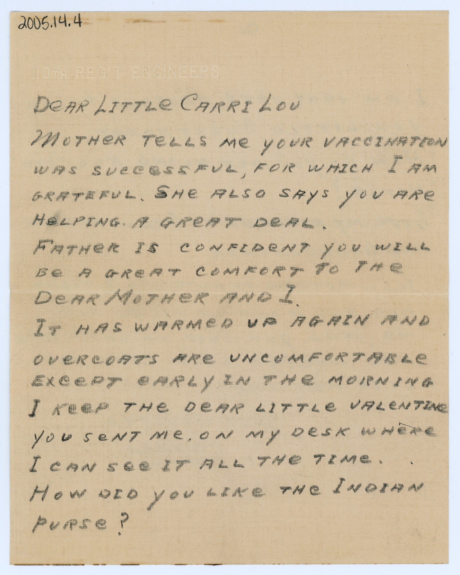 DeAR LITTLE CARRI LOU MOTHER TELLS ME YOUR VACCINATION WAS SUCCESSFUL, FOR WHICH I AM GRATEFUL. SHE ALSO SAYS YOU ARE HELPING A GREAT DEAL. FATHER IS CONFIDENT YOU WILL BE A GREAT COMFORT TO THE DEAR MOTHER AND I. IT HAS WARMED UP AGAIN AND OVERCOATS ARE UNCOMFORTABLE EXCEPT EARLY IN THE MORNING I KEEP THE DEAR LITTLE VALENTINE YOU SENT ME, ON MY DESK WHERE I CAN SEE ITA LL THE TIME. HOW DID YOU LIKE THE INDIAN PURSE?