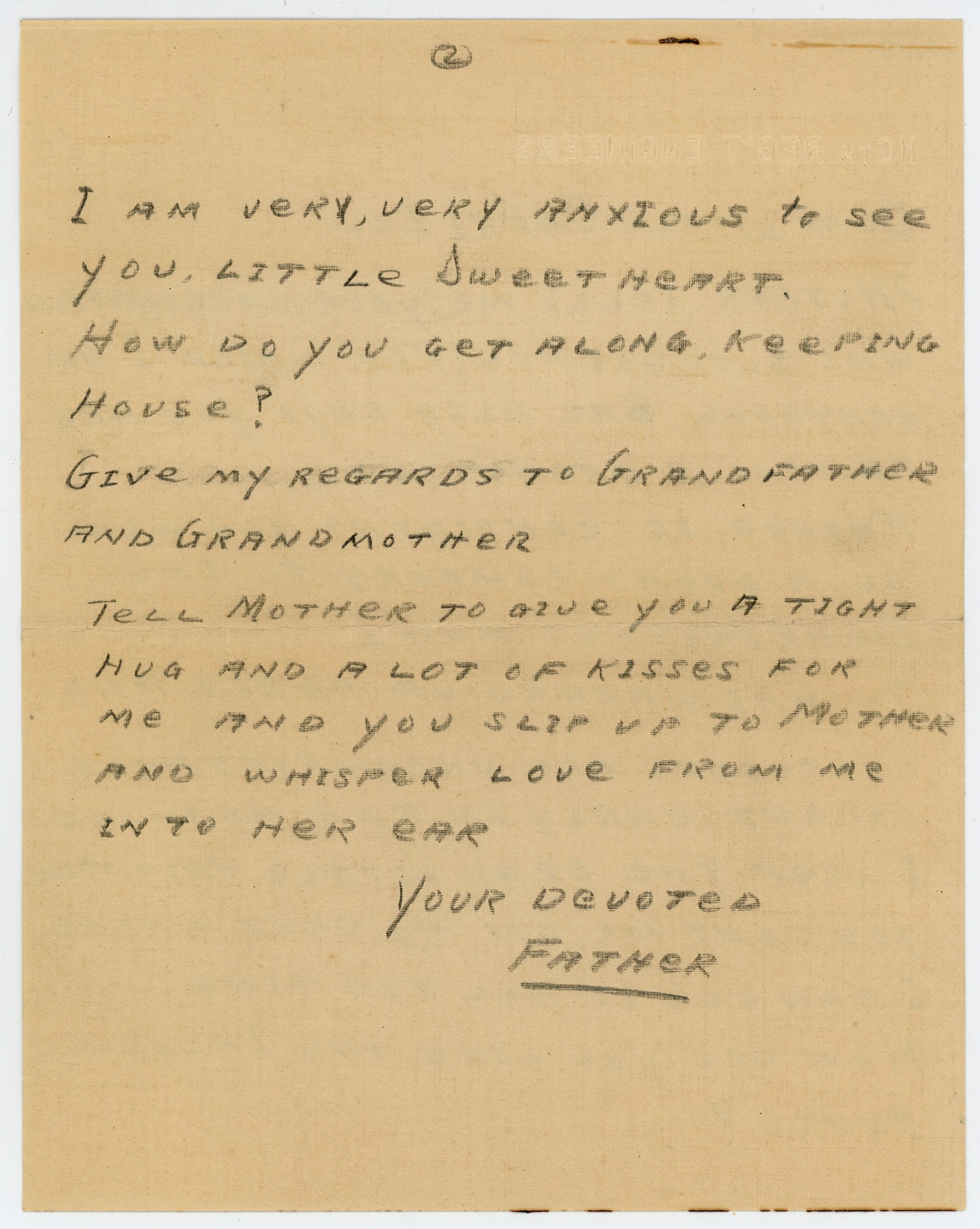 [page 2] I AM VeRY, VeRY ANXIOUS to see you, LITTLE SWEETHEART. HOW DO you GeT ALONG, KeePING House? GIVE MY ReGARDS TO GRANDFATHeR AND GRANDMOTHeR TeLL MOTHeR TO GIVe YOU A TIGHT HUG AND A LOT OF KISSeS FOR Me AND YOU SLIP UP TO MOTHeR AND WHISPeR LOVe FROM Me INTO HeR Ear YOUR DeVOTeD FATHeR