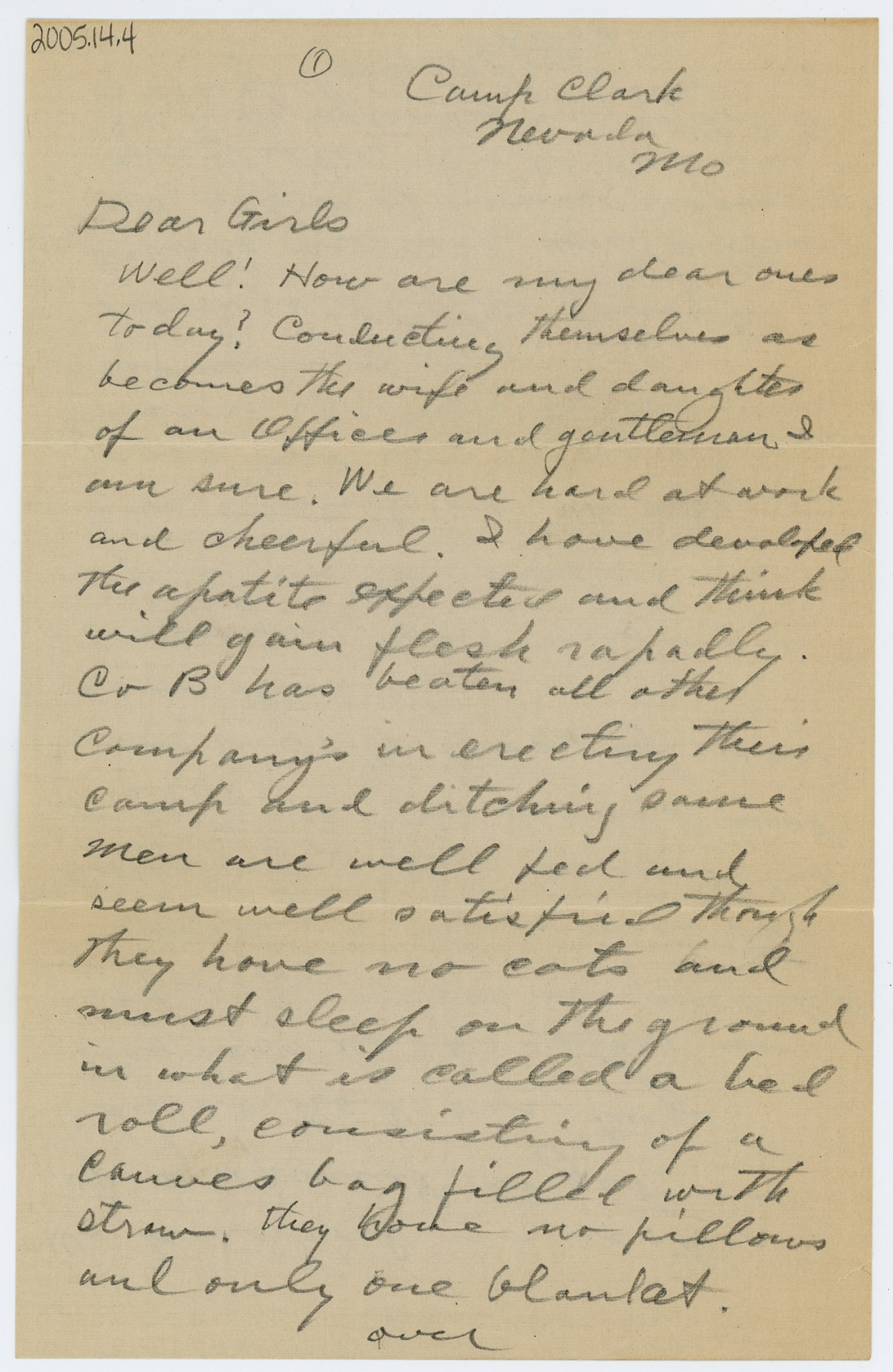 [page 1] Camp Clark Nevada [Missouri] Dear Girls Well! How are my dear ones today? Conducting themselves as becomes the wife and daughter of an Officer and gentleman I am sure. We are hard at work and cheerful. I have developed the apatite expected and think will gain flesh rapadly. Co B has beaten all other Company