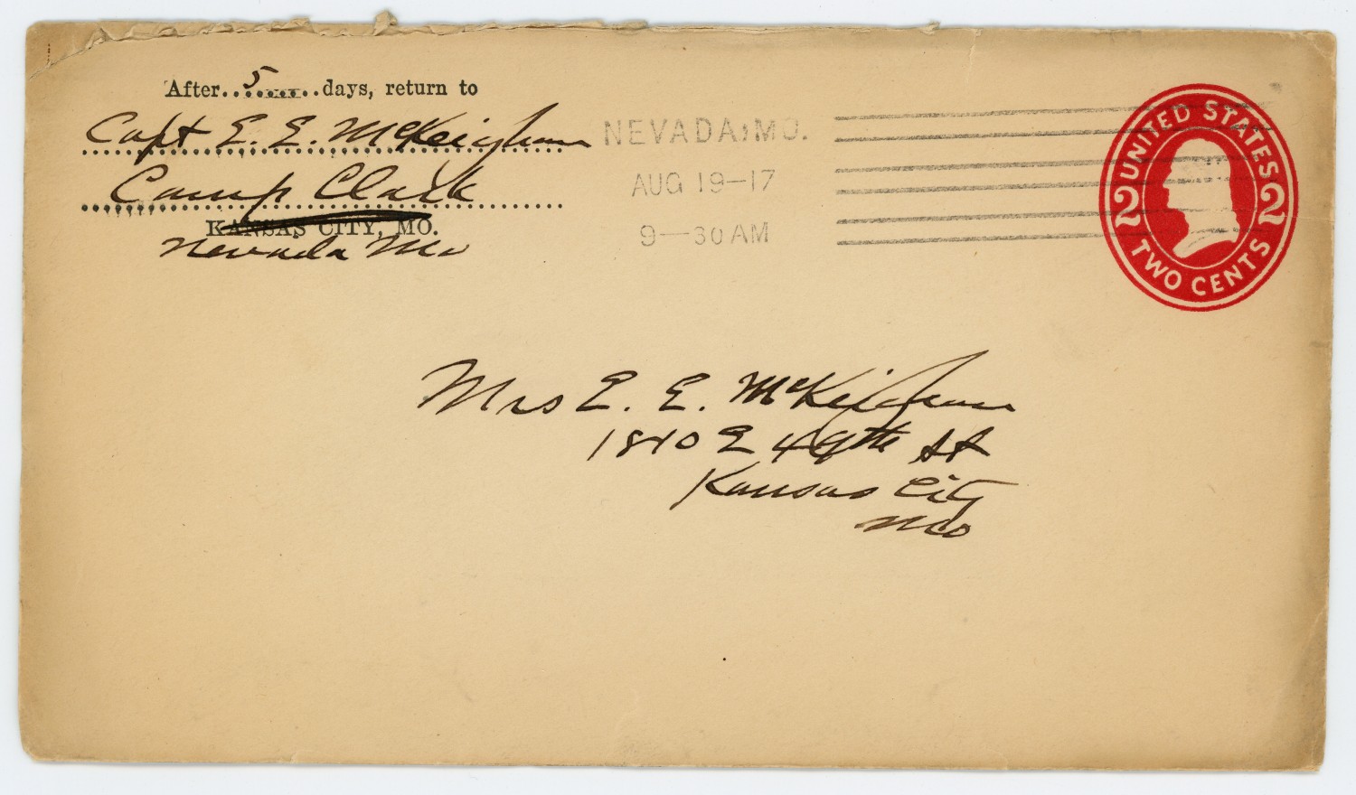 [envelope] After 5 days, return to Capt. E.E. McKeighan Camp Clark Nevada [Missouri] NEVADA, [Missouri] [August 19, 1917] 9-30 AM [stamp] MRS CAPT McKEIGHAN 1810 E 49th St Kansas City [Missouri]