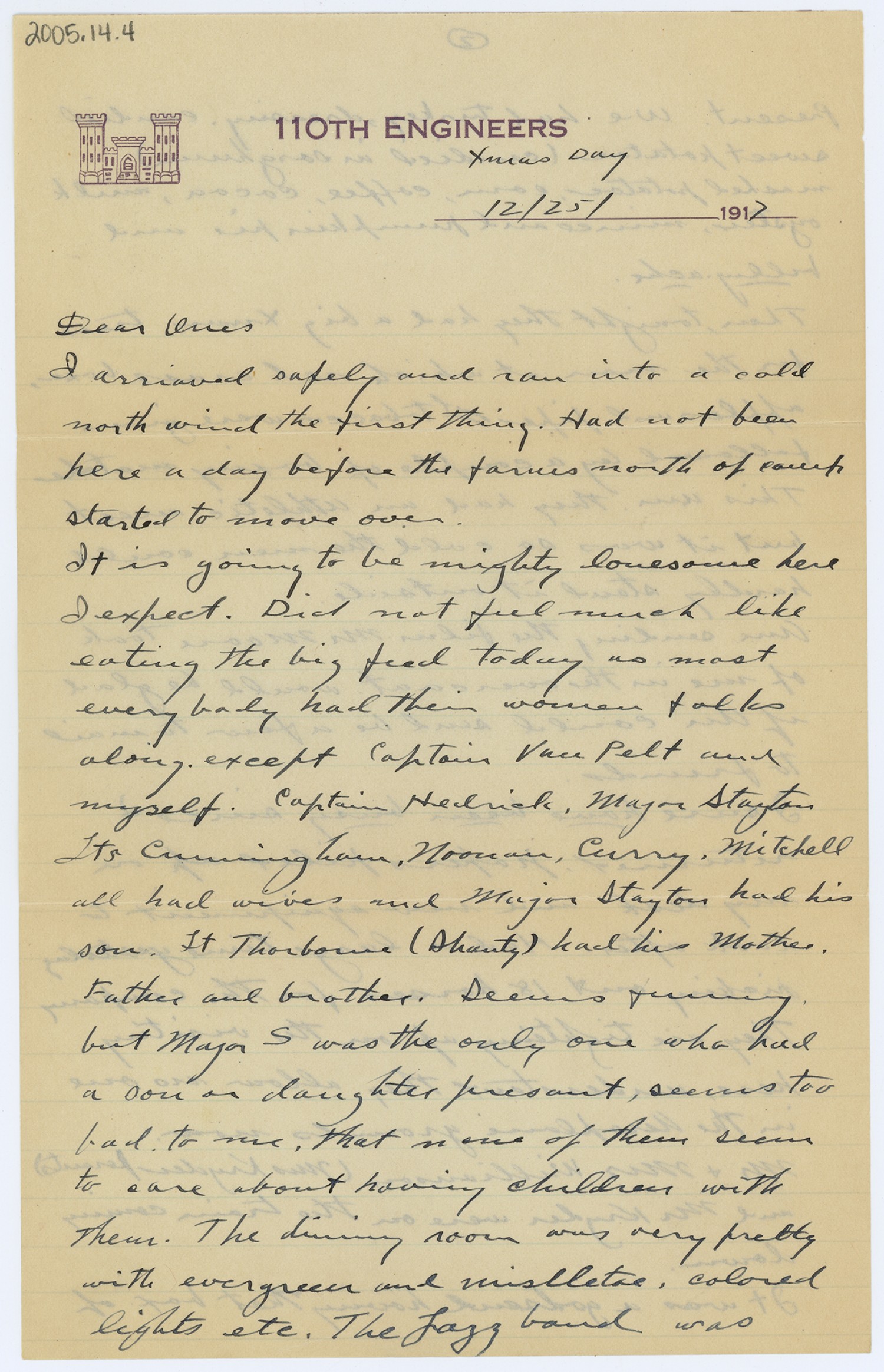 [110th Engineers letterhead] Xmas Day 12/25/1917 Dear ones I arrived safely and ran into a cold north wind the first thing. Had not been here a day before the farms north of camp started to move over. It is going to be mighty lonesome here I expect. Did not feel much like eating the big feed today as most every body had their women folks along, except Captain Van Pelt and myself. Captain Hedrick, Major Stayton Lts Cunningham, Nooman, Curry, Mitchell all had wives and Major Stayton had his son. Lt Thorborne (Shanty) had his Mother, Father and brother. Seems funny but Major S was the only one who had a son or daughter present, seems too bad to me, that none of them seem to care about having children with them. The dinning rom was very pretty with evergreen and mislletoe, colored lights etc. The Jazz band was